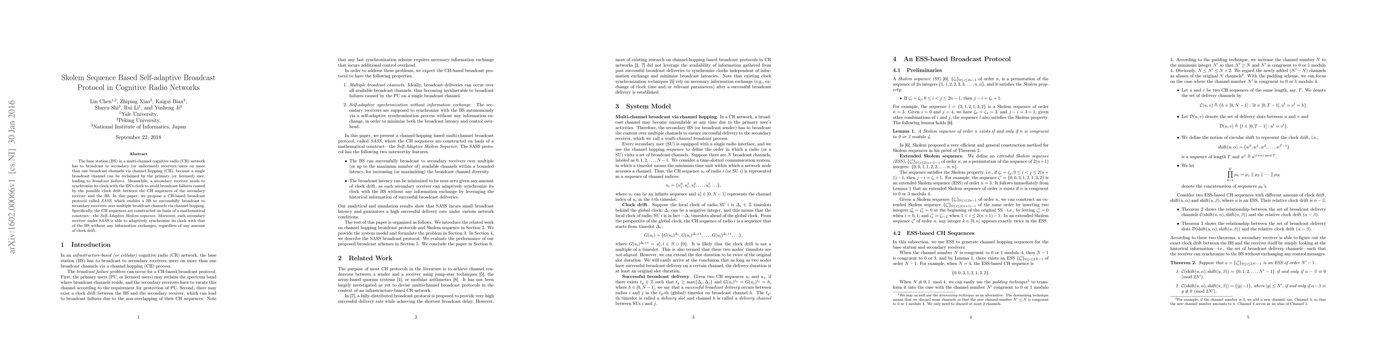 The base station (BS) in a multi-channel cognitive radio (CR) network has to broadcast to secondary (or unlicensed) receivers/users on more than one broadcast channels via channel hopping (CH), because a single broadcast channel can be reclaimed by the primary (or licensed) user, leading to broadcast failures. Meanwhile, a secondary receiver needs to synchronize its clock with the BS's clock to avoid broadcast failures caused by the possible clock drift between the CH sequences of the secondary receiver and the BS. In this paper, we propose a CH-based broadcast protocol called SASS, which enables a BS to successfully broadcast to secondary receivers over multiple broadcast channels via channel hopping. Specifically, the CH sequences are constructed on basis of a mathematical construct---the Self-Adaptive Skolem sequence. Moreover, each secondary receiver under SASS is able to adaptively synchronize its clock with that of the BS without any information exchanges, regardless of any amount of clock drift.