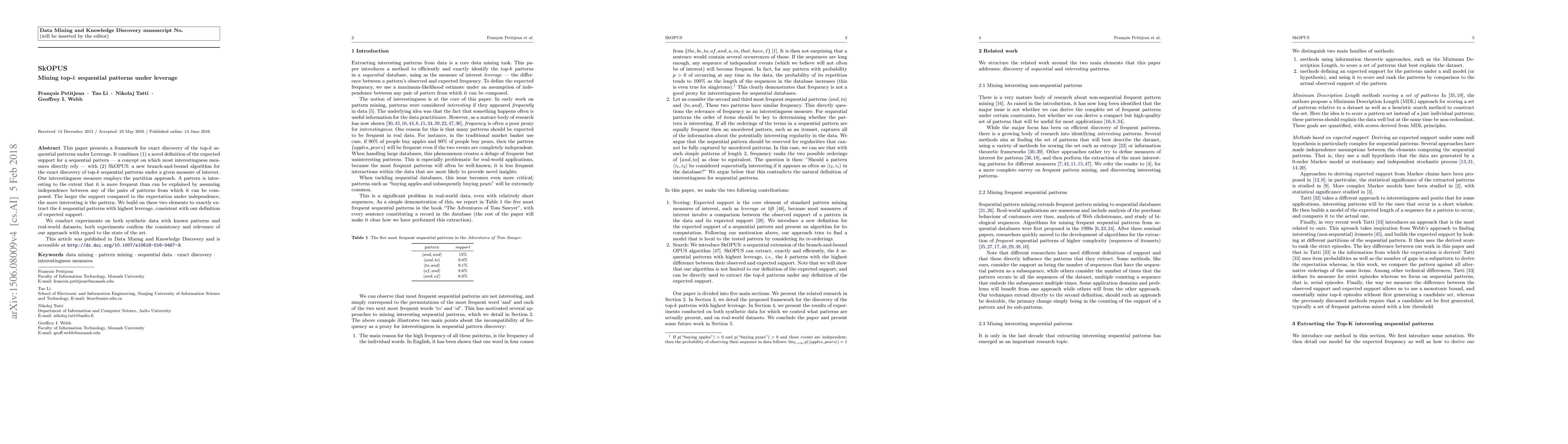 This paper presents a framework for exact discovery of the top-k sequential patterns under Leverage. It combines (1) a novel definition of the expected support for a sequential pattern - a concept on which most interestingness measures directly rely - with (2) SkOPUS: a new branch-and-bound algorithm for the exact discovery of top-k sequential patterns under a given measure of interest. Our interestingness measure employs the partition approach. A pattern is interesting to the extent that it is more frequent than can be explained by assuming independence between any of the pairs of patterns from which it can be composed. The larger the support compared to the expectation under independence, the more interesting is the pattern. We build on these two elements to exactly extract the k sequential patterns with highest leverage, consistent with our definition of expected support. We conduct experiments on both synthetic data with known patterns and real-world datasets; both experiments confirm the consistency and relevance of our approach with regard to the state of the art. This article was published in Data Mining and Knowledge Discovery and is accessible at http://dx.doi.org/10.1007/s10618-016-0467-9.