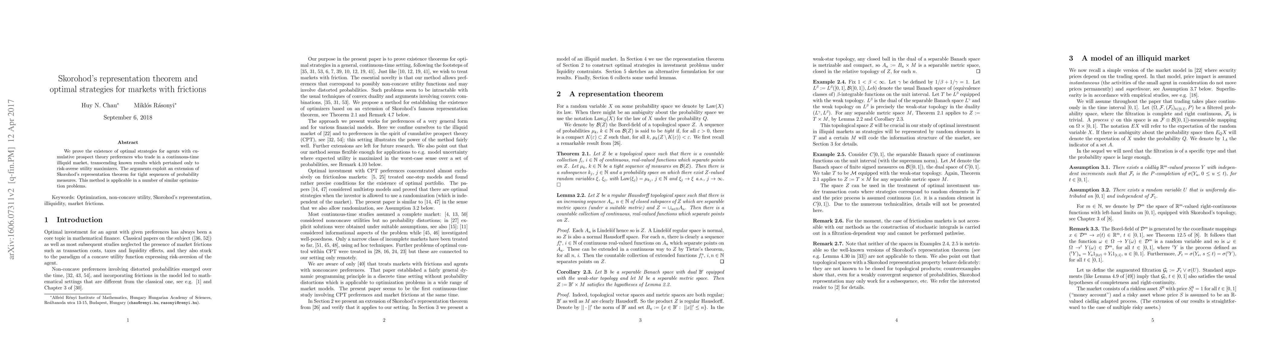 This paper proves the existence of optimal strategies for agents with cumulative prospect theory preferences in continuous-time illiquid markets. It builds on Skorohod's representation theorem to find solutions applicable to similar optimization problems.