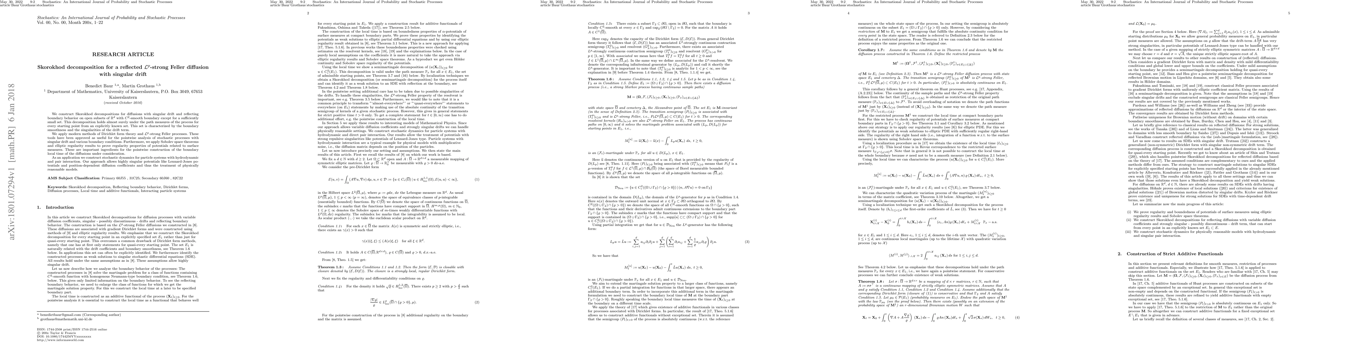 We construct Skorokhod decompositions for diffusions with singular drift and reflecting boundary behavior on open subsets of $\mathbb R^d$ with $C^2$-smooth boundary except for a sufficiently small set. This decomposition holds almost surely under the path measures of the process for every starting point from an explicitly known set. This set is characterized by the boundary smoothness and the singularities of the drift term. We apply modern methods of Dirichlet form theory and $\mathcal L^p$-strong Feller processes. These tools have been approved as useful for the pointwise analysis of stochastic processes with singular drift and various boundary conditions. Furthermore, we apply Sobolev space theorems and elliptic regularity results to prove regularity properties of potentials related to surface measures. These are important ingredients for the pointwise construction of the boundary local time of the diffusions under consideration. As an application we construct stochastic dynamics for particle systems with hydrodynamic and pair interaction. Our approach allows highly singular potentials like Lennard-Jones potentials and position-dependent diffusion coefficients and thus the treatment of physically reasonable models.