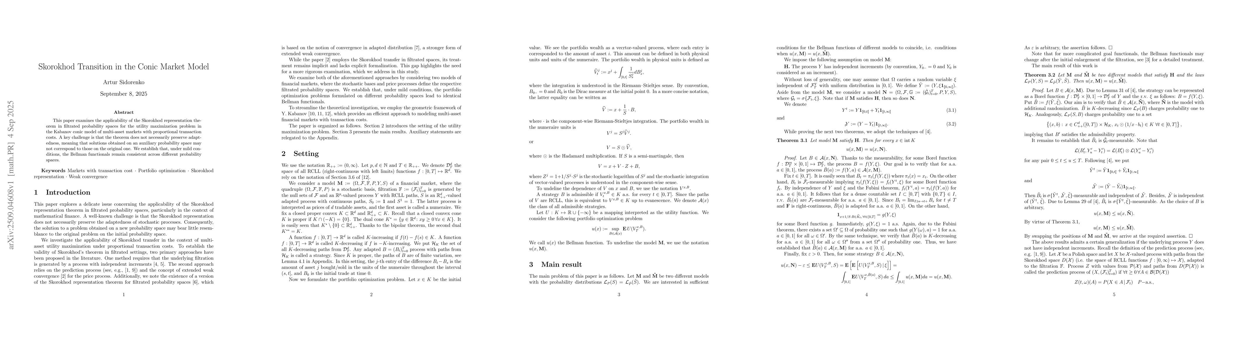 This paper examines the applicability of the Skorokhod representation theorem in filtrated probability spaces for the utility maximization problem in the Kabanov conic model of multi-asset markets with proportional transaction costs. A key challenge is that the theorem does not necessarily preserve adaptedness, meaning that solutions obtained on an auxiliary probability space may not correspond to those on the original one. We establish that, under mild conditions, the Bellman functionals remain consistent across different probability spaces.