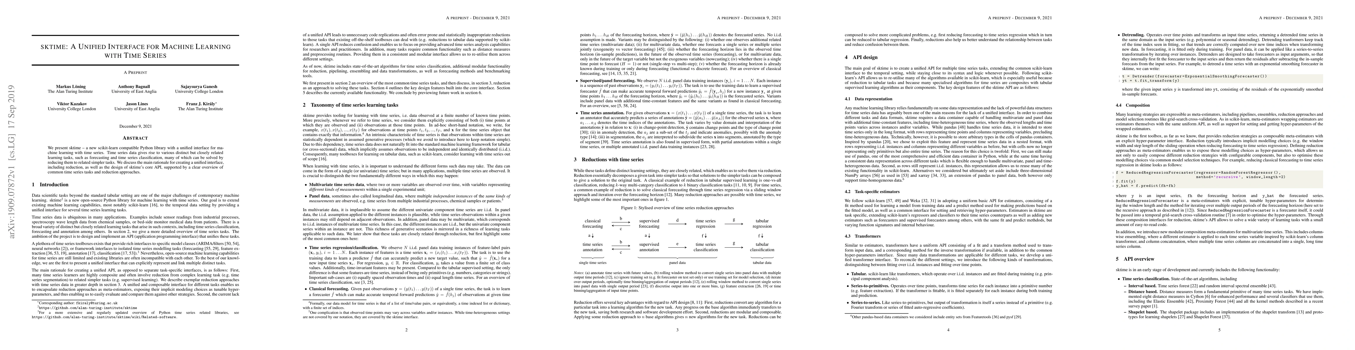 sktime is a new Python library designed to provide a unified interface for machine learning tasks involving time series data, compatible with scikit-learn. It aims to simplify complex time series tasks through reduction to simpler tasks, offering a clear API for forecasting and classification.