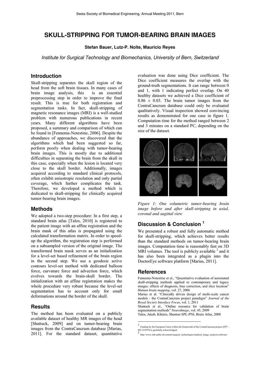 Skull-stripping separates the skull region of the head from the soft brain tissues. In many cases of brain image analysis, this is an essential preprocessing step in order to improve the final result. This is true for both registration and segmentation tasks. In fact, skull-stripping of magnetic resonance images (MRI) is a well-studied problem with numerous publications in recent years. Many different algorithms have been proposed, a summary and comparison of which can be found in [Fennema-Notestine, 2006]. Despite the abundance of approaches, we discovered that the algorithms which had been suggested so far, perform poorly when dealing with tumor-bearing brain images. This is mostly due to additional difficulties in separating the brain from the skull in this case, especially when the lesion is located very close to the skull border. Additionally, images acquired according to standard clinical protocols, often exhibit anisotropic resolution and only partial coverage, which further complicates the task. Therefore, we developed a method which is dedicated to skull-stripping for clinically acquired tumor-bearing brain images.