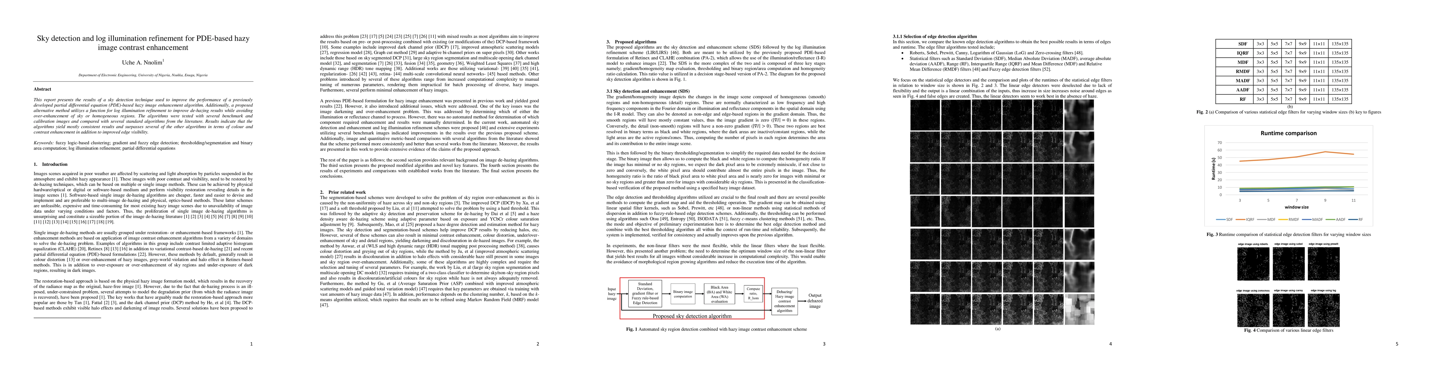 This report presents the results of a sky detection technique used to improve the performance of a previously developed partial differential equation (PDE)-based hazy image enhancement algorithm. Additionally, a proposed alternative method utilizes a function for log illumination refinement to improve de-hazing results while avoiding over-enhancement of sky or homogeneous regions. The algorithms were tested with several benchmark and calibration images and compared with several standard algorithms from the literature. Results indicate that the algorithms yield mostly consistent results and surpasses several of the other algorithms in terms of colour and contrast enhancement in addition to improved edge visibility.