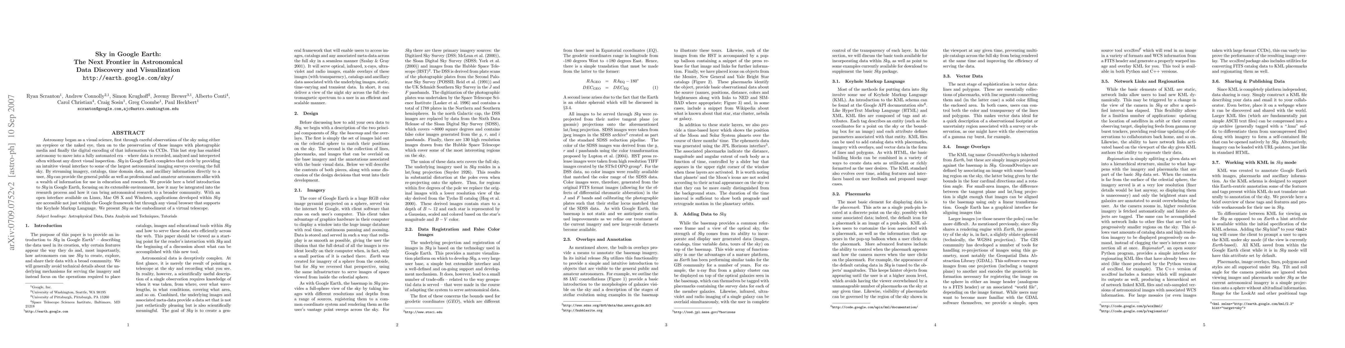 "Sky in Google Earth" offers a visual interface for large astronomical surveys, enabling both public and professional users to access and analyze vast amounts of astronomical data, thus democratizing astronomical research and education. Its open interface allows applications to be accessible across various platforms and browsers.