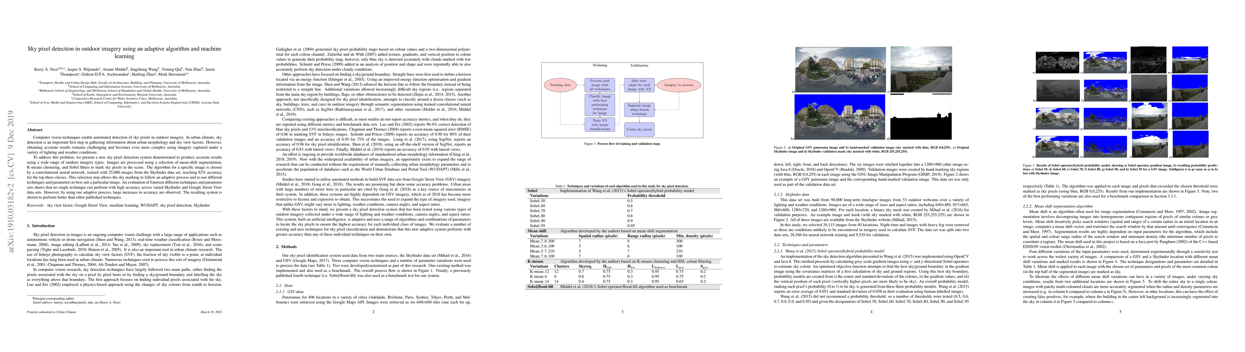 Computer vision techniques enable automated detection of sky pixels in outdoor imagery. In urban climate, sky detection is an important first step in gathering information about urban morphology and sky view factors. However, obtaining accurate results remains challenging and becomes even more complex using imagery captured under a variety of lighting and weather conditions. To address this problem, we present a new sky pixel detection system demonstrated to produce accurate results using a wide range of outdoor imagery types. Images are processed using a selection of mean-shift segmentation, K-means clustering, and Sobel filters to mark sky pixels in the scene. The algorithm for a specific image is chosen by a convolutional neural network, trained with 25,000 images from the Skyfinder data set, reaching 82% accuracy for the top three classes. This selection step allows the sky marking to follow an adaptive process and to use different techniques and parameters to best suit a particular image. An evaluation of fourteen different techniques and parameter sets shows that no single technique can perform with high accuracy across varied Skyfinder and Google Street View data sets. However, by using our adaptive process, large increases in accuracy are observed. The resulting system is shown to perform better than other published techniques.