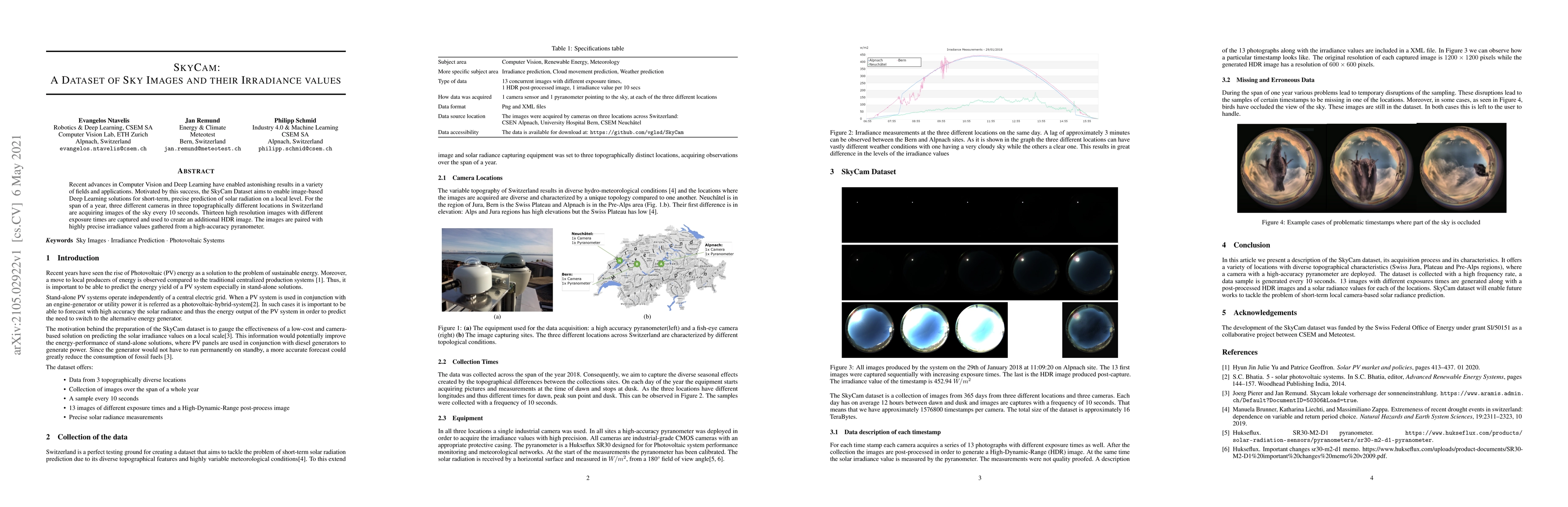 Recent advances in Computer Vision and Deep Learning have enabled astonishing results in a variety of fields and applications. Motivated by this success, the SkyCam Dataset aims to enable image-based Deep Learning solutions for short-term, precise prediction of solar radiation on a local level. For the span of a year, three different cameras in three topographically different locations in Switzerland are acquiring images of the sky every 10 seconds. Thirteen high resolution images with different exposure times are captured and used to create an additional HDR image. The images are paired with highly precise irradiance values gathered from a high-accuracy pyranometer.