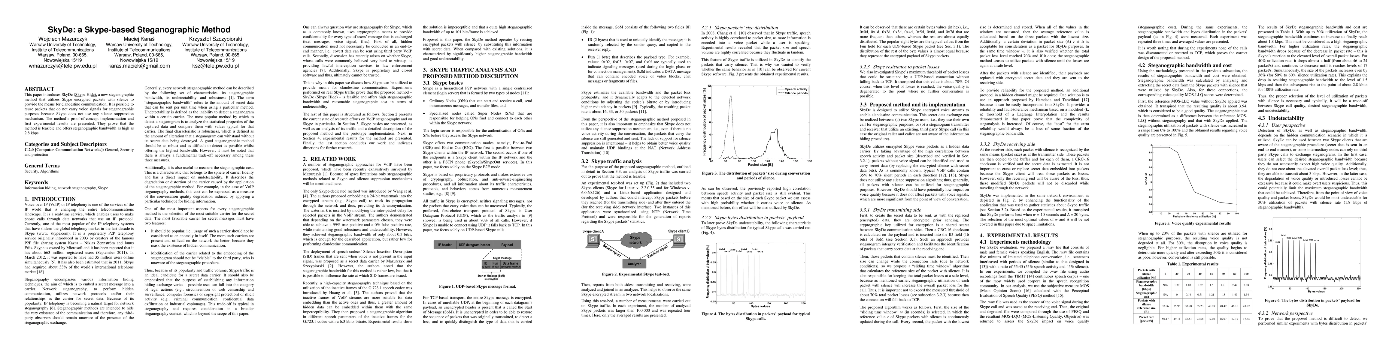 SkyDe is a novel steganographic method that leverages Skype's encrypted packets during silence for covert communication, achieving up to 2.8 kbps bandwidth. Initial experiments confirm its feasibility and effectiveness.
