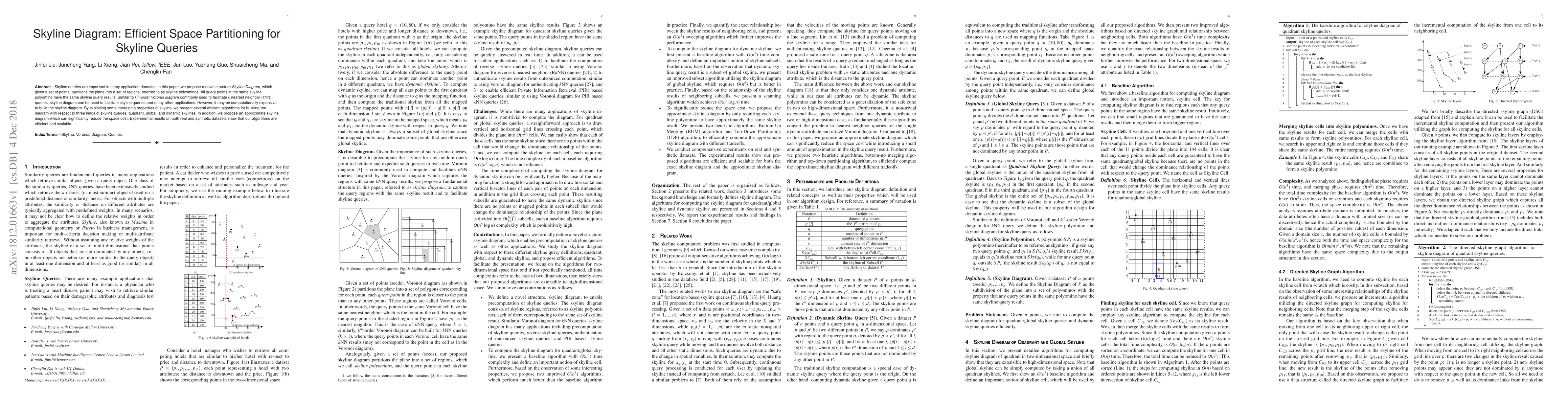 This paper introduces the Skyline Diagram, a novel spatial partitioning structure that organizes points into skyline polyominos, optimizing skyline queries. It presents efficient algorithms to construct this diagram for various types of skyline queries and introduces an approximate version to reduce space costs, validated by scalable experimental results.