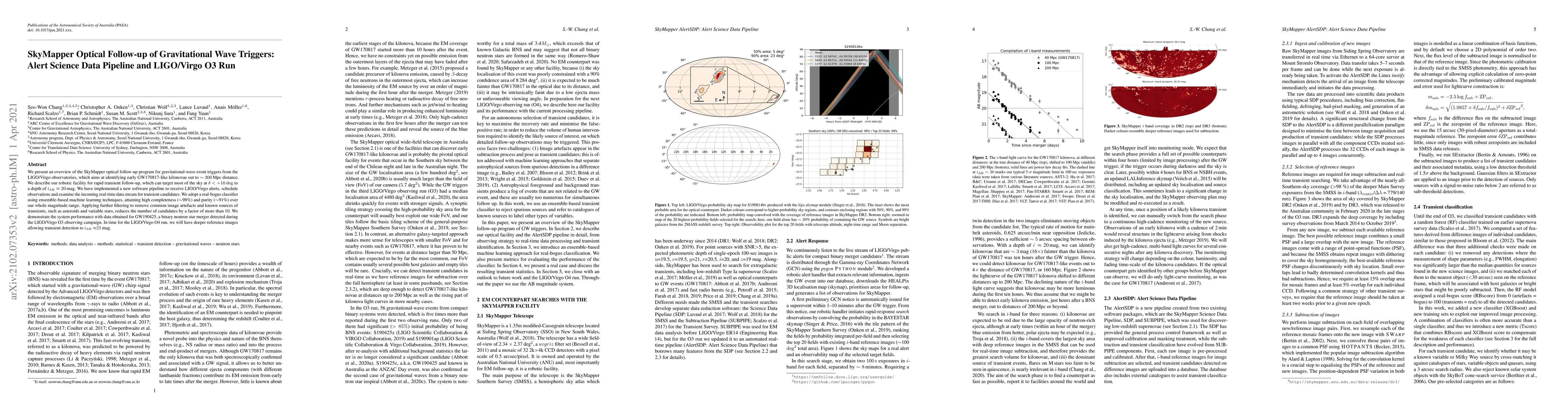 This paper details the SkyMapper optical follow-up program for gravitational wave triggers from LIGO/Virgo, focusing on identifying kilonovae. It describes a robotic system for rapid sky coverage and a new data pipeline for real-time transient detection, achieving high completeness and purity using machine learning.