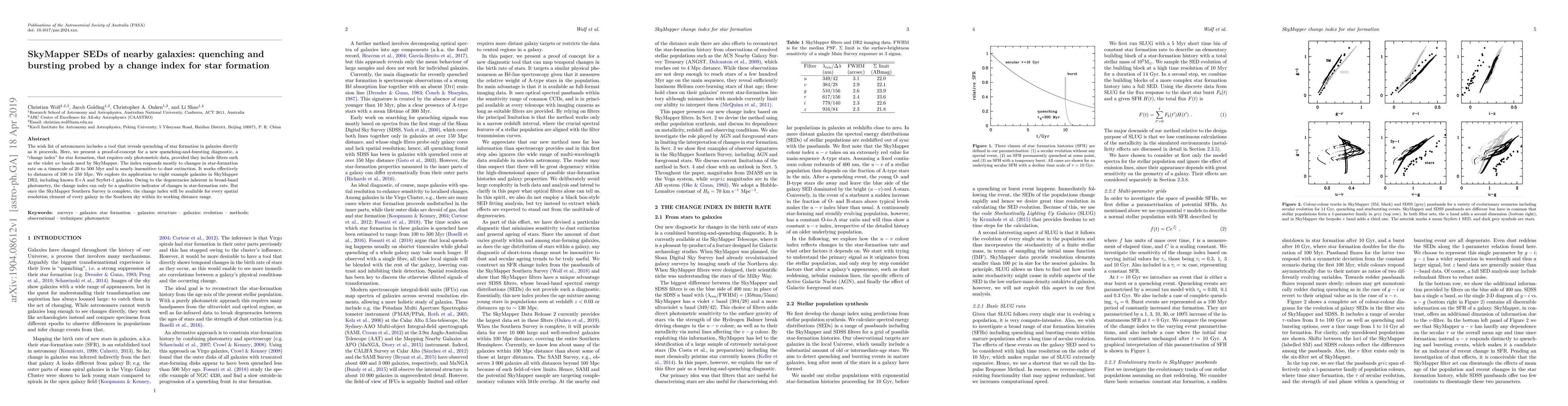 The wish list of astronomers includes a tool that reveals quenching of star formation in galaxies directly as it proceeds. Here, we present a proof-of-concept for a new quenching-and-bursting diagnostic, a "change index" for star formation, that requires only photometric data, provided they include filters such as the violet $uv$ bands used by SkyMapper. The index responds mostly to changes in star-formation rate on a timescale of 20 to 500 Myr and is nearly insensitive to dust extinction. It works effectively to distances of 100 to 150 Mpc. We explore its application to eight example galaxies in SkyMapper DR2, including known E+A and Seyfert-1 galaxies. Owing to the degeneracies inherent in broad-band photometry, the change index can only be a qualitative indicator of changes in star-formation rate. But once the SkyMapper Southern Survey is complete, the change index will be available for every spatial resolution element of every galaxy in the Southern sky within its working distance range.