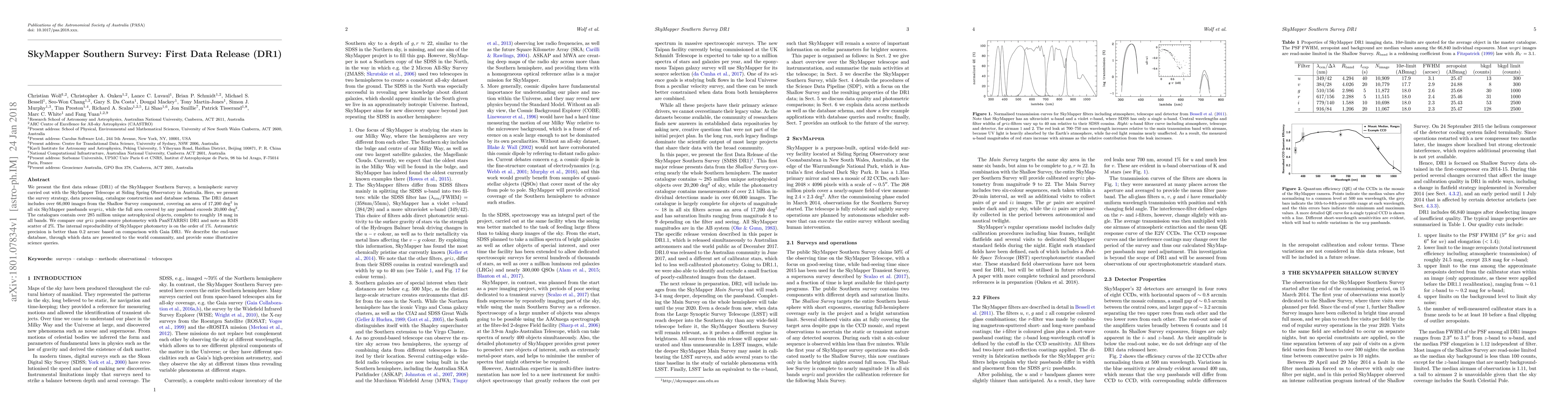 The SkyMapper Southern Survey's first data release (DR1) includes over 66,000 images covering 17,200 deg$^2$ in six passbands, cataloging 285 million objects. The survey demonstrates high photometric and astrometric accuracy, with 2% RMS scatter compared to PanSTARRS1 and 0.2 arcsec astrometric precision relative to Gaia DR1.