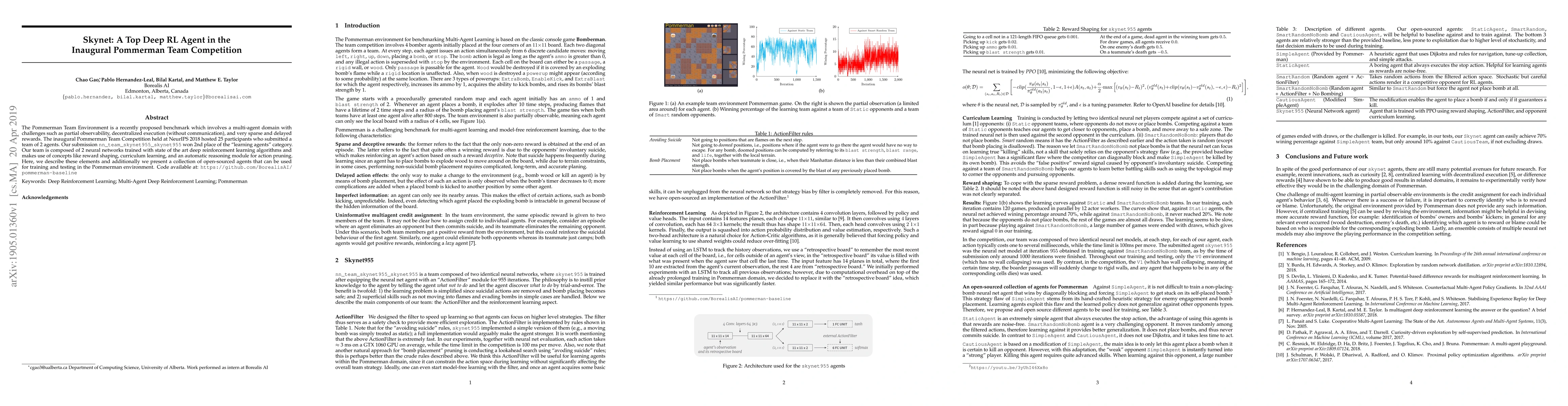 The paper describes the development of "nn_team_skynet955_skynet955," a top deep reinforcement learning agent that secured 2nd place in the "learning agents" category at the inaugural Pommerman Team Competition. The agent employs advanced techniques including reward shaping, curriculum learning, and an automatic reasoning module for action pruning.