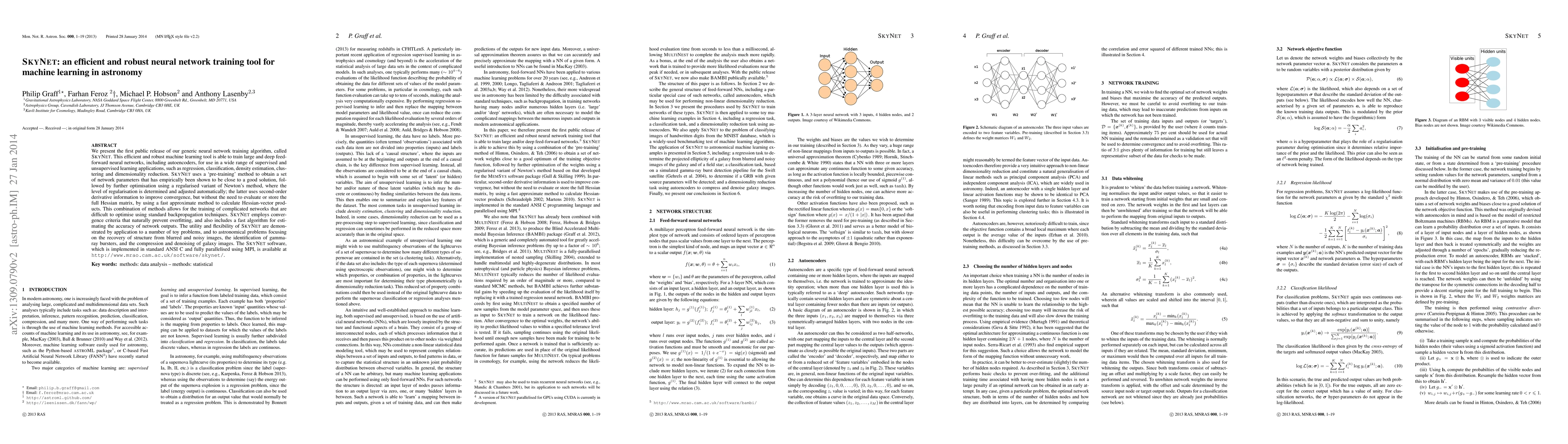 We present the first public release of our generic neural network training algorithm, called SkyNet. This efficient and robust machine learning tool is able to train large and deep feed-forward neural networks, including autoencoders, for use in a wide range of supervised and unsupervised learning applications, such as regression, classification, density estimation, clustering and dimensionality reduction. SkyNet uses a `pre-training' method to obtain a set of network parameters that has empirically been shown to be close to a good solution, followed by further optimisation using a regularised variant of Newton's method, where the level of regularisation is determined and adjusted automatically; the latter uses second-order derivative information to improve convergence, but without the need to evaluate or store the full Hessian matrix, by using a fast approximate method to calculate Hessian-vector products. This combination of methods allows for the training of complicated networks that are difficult to optimise using standard backpropagation techniques. SkyNet employs convergence criteria that naturally prevent overfitting, and also includes a fast algorithm for estimating the accuracy of network outputs. The utility and flexibility of SkyNet are demonstrated by application to a number of toy problems, and to astronomical problems focusing on the recovery of structure from blurred and noisy images, the identification of gamma-ray bursters, and the compression and denoising of galaxy images. The SkyNet software, which is implemented in standard ANSI C and fully parallelised using MPI, is available at http://www.mrao.cam.ac.uk/software/skynet/.