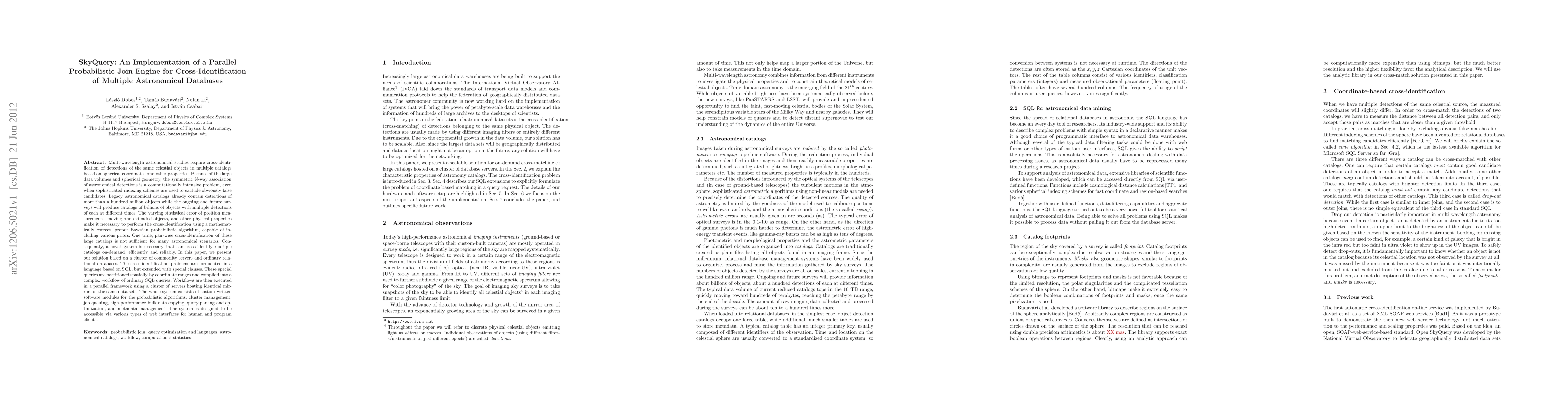 SkyQuery introduces a parallel probabilistic join engine for efficiently cross-identifying celestial objects across multiple astronomical databases. It leverages a cluster of servers and relational databases to handle the computationally intensive task of associating detections from large, multi-wavelength catalogs using a Bayesian probabilistic algorithm.