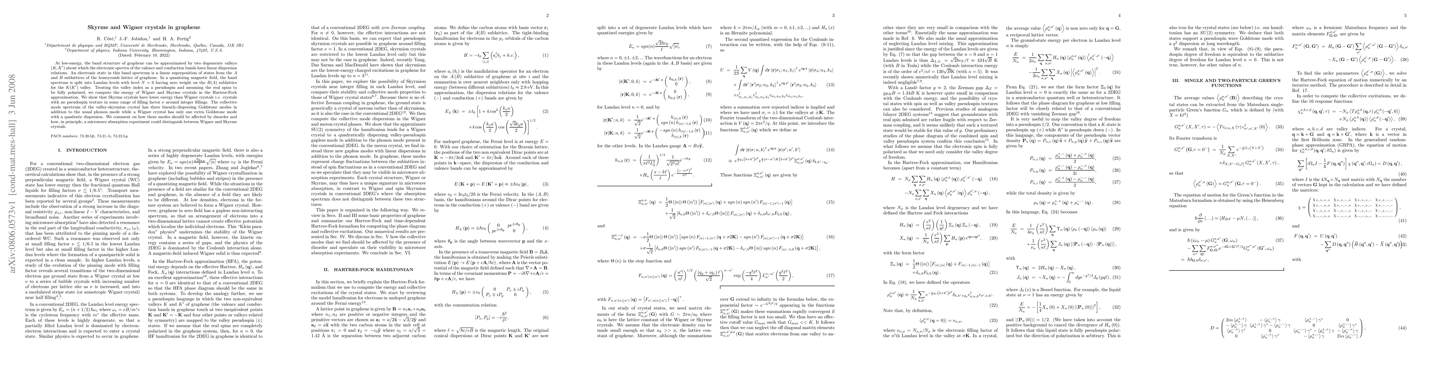 This paper investigates the energy states of Wigner and Skyrme crystals in graphene under a quantizing magnetic field. It finds that Skyrme crystals, characterized by pseudospin texture, have lower energy than Wigner crystals in certain filling factor ranges, and exhibit distinct collective mode spectra.