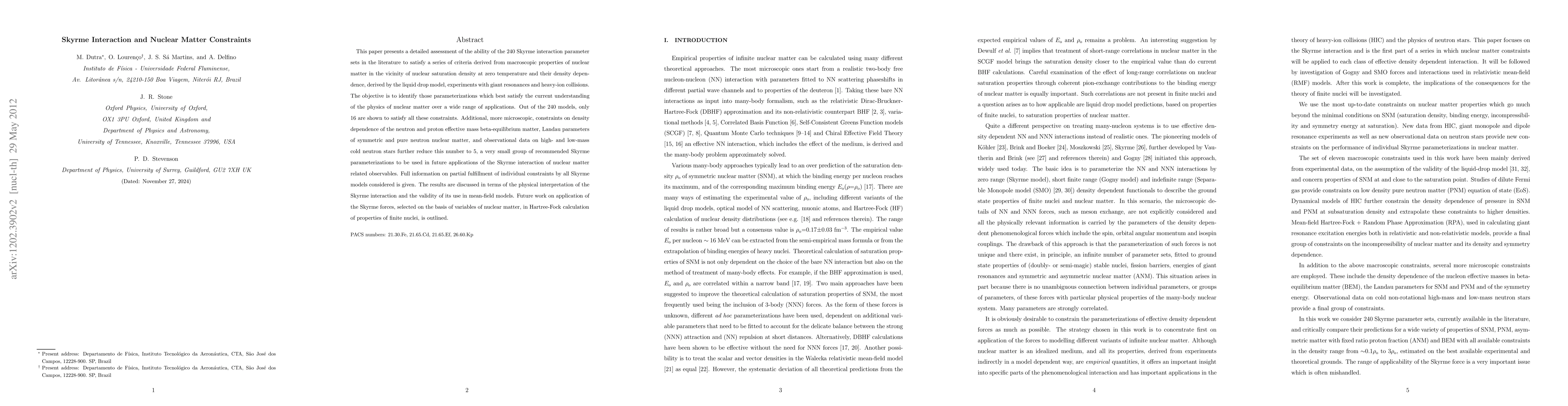 This paper evaluates 240 Skyrme interaction parameter sets against nuclear matter constraints, identifying only 5 that best match current nuclear physics understanding for future applications. The selection process involves macroscopic properties, density dependence, and observational data from neutron stars.