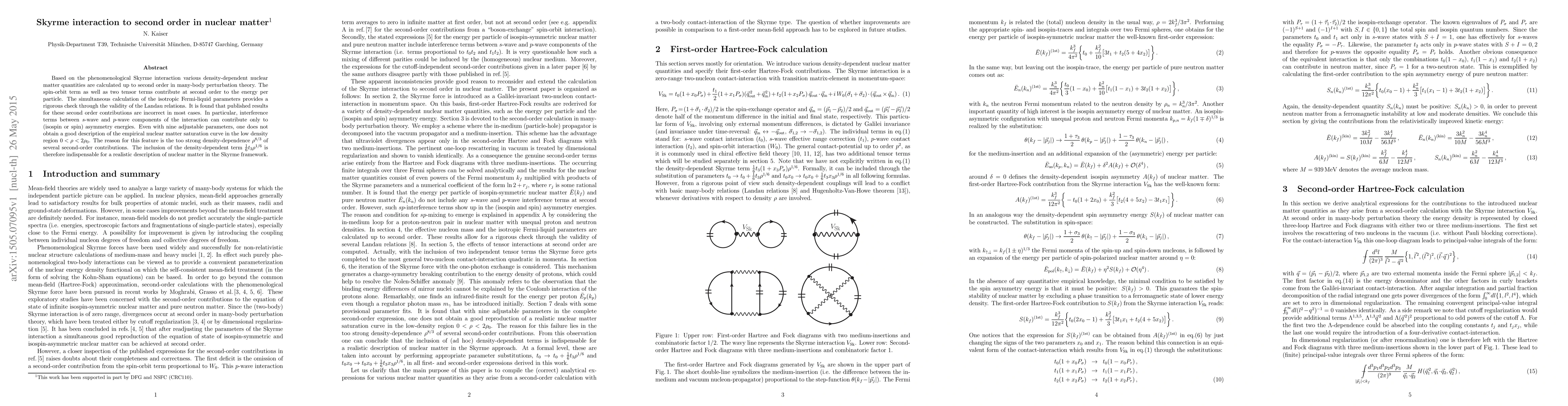 Based on the phenomenological Skyrme interaction various density-dependent nuclear matter quantities are calculated up to second order in many-body perturbation theory. The spin-orbit term as well as two tensor terms contribute at second order to the energy per particle. The simultaneous calculation of the isotropic Fermi-liquid parameters provides a rigorous check through the validity of the Landau relations. It is found that published results for these second order contributions are incorrect in most cases. In particular, interference terms between $s$-wave and $p$-wave components of the interaction can contribute only to (isospin or spin) asymmetry energies. Even with nine adjustable parameters, one does not obtain a good description of the empirical nuclear matter saturation curve in the low density region $0<\rho<2\rho_0$. The reason for this feature is the too strong density-dependence $\rho^{8/3}$ of several second-order contributions. The inclusion of the density-dependent term ${1\over 6}t_3 \rho^{1/6}$ is therefore indispensable for a realistic description of nuclear matter in the Skyrme framework.