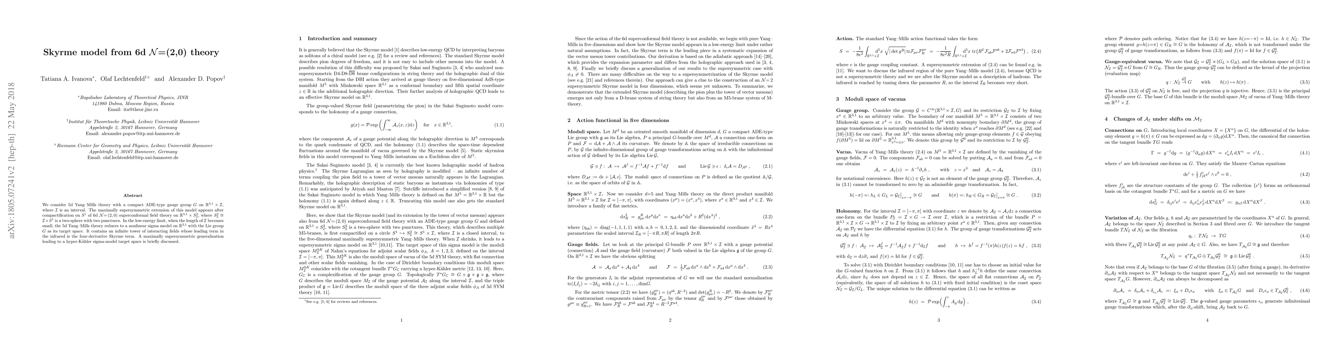 We consider 5d Yang-Mills theory with a compact ADE-type gauge group $G$ on ${\mathbb R}^{3,1}\times{\cal I}$, where $\cal I$ is an interval. The maximally supersymmetric extension of this model appears after compactification on $S^1$ of 6d $\cal N$= (2,0) superconformal field theory on ${\mathbb R}^{3,1}\times S^2_2$, where $S^2_2\cong{\cal I}\times S^1$ is a two-sphere with two punctures. In the low-energy limit, when the length of $\cal I$ becomes small, the 5d Yang-Mills theory reduces to a nonlinear sigma model on ${\mathbb R}^{3,1}$ with the Lie group $G$ as its target space. It contains an infinite tower of interacting fields whose leading term in the infrared is the four-derivative Skyrme term. A maximally supersymmetric generalization leading to a hyper-K\"ahler sigma-model target space is briefly discussed.