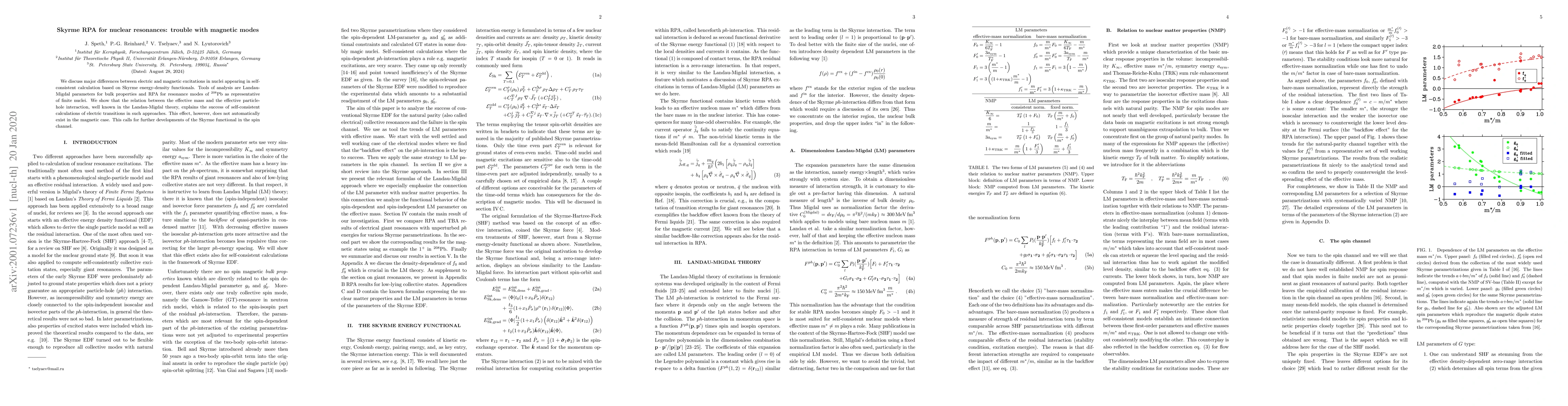 This paper investigates discrepancies between electric and magnetic excitations in nuclei using Skyrme RPA and finds that while the effective mass and interaction relation works well for electric transitions, it fails for magnetic modes, necessitating improvements in the Skyrme functional for spin-dependent interactions.