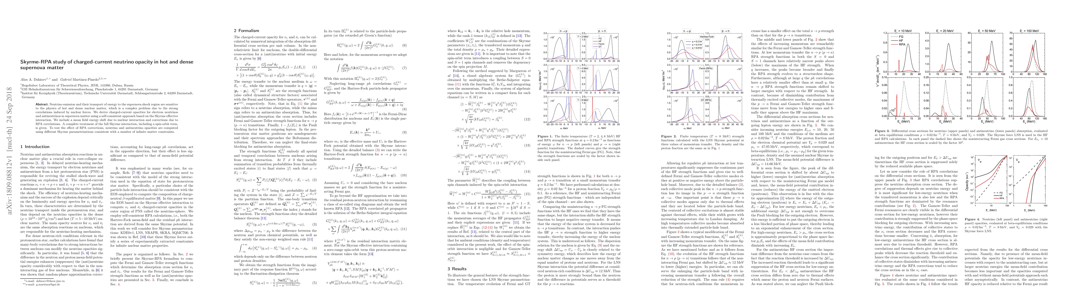 This paper derives charged-current opacities for electron neutrinos and antineutrinos in hot and dense supernova matter using the Skyrme effective interaction and RPA correlations, aiming to understand neutrino transport in the supernova shock region. The study includes mean field energy shifts and full Skyrme interaction, testing RPA corrections with different parametrizations.
