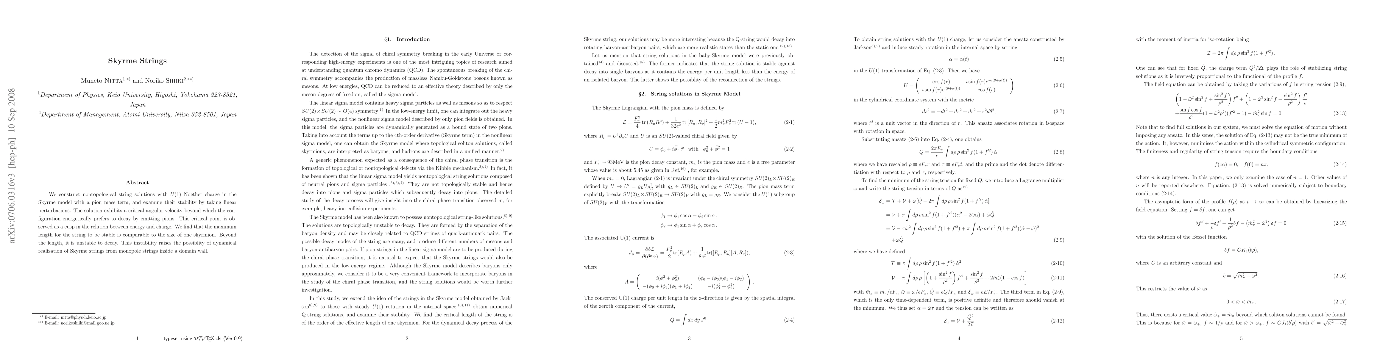 We construct nontopological string solutions with U(1) Noether charge in the Skyrme model with a pion mass term, and examine their stability by taking linear perturbations. The solution exhibits a critical angular velocity beyond which the configuration energetically prefers to decay by emitting pions. This critical point is observed as a cusp in the relation between energy and charge. We find that the maximum length for the string to be stable is comparable to the size of one skyrmion. Beyond the length, it is unstable to decay. This instability raises the possiblity of dynamical realization of Skyrme strings from monopole strings inside a domain wall.