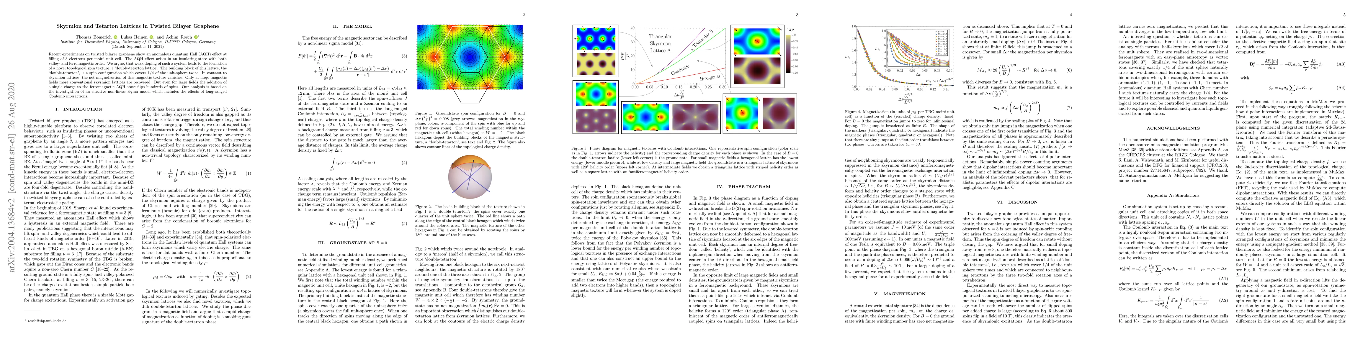 Recent experiments on twisted bilayer graphene show an anomalous quantum Hall (AQH) effect at filling of $3$ electrons per moir\`e unit cell. The AQH effect arises in an insulating state with both valley- and ferromagnetic order. We argue, that weak doping of such a system leads to the formation of a novel topological spin texture, a `double-tetarton lattice'. The building block of this lattice, the `double-tetarton', is a spin configuration which covers $1/4$ of the unit-sphere twice. In contrast to skyrmion lattices, the net magnetization of this magnetic texture vanishes. Only at large magnetic fields more conventional skyrmion lattices are recovered. But even for large fields the addition of a single charge to the ferromagnetic AQH state flips hundreds of spins. Our analysis is based on the investigation of an effective non-linear sigma model which includes the effects of long-ranged Coulomb interactions.