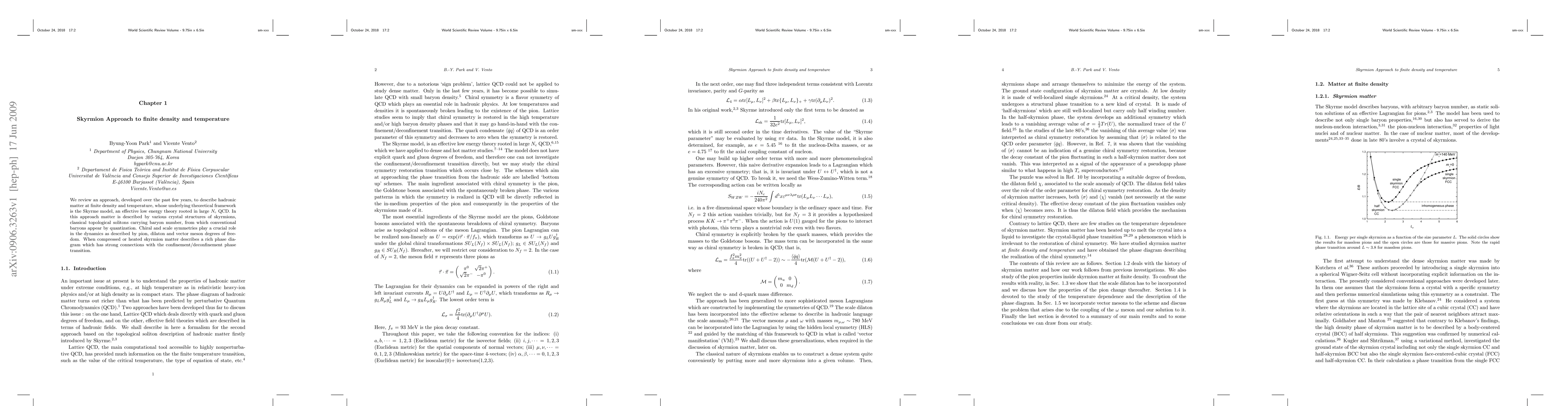 We review an approach, developed over the past few years, to describe hadronic matter at finite density and temperature, whose underlying theoretical framework is the Skyrme model, an effective low energy theory rooted in large $N_c$ QCD. In this approach matter is described by various crystal structures of skyrmions, classical topological solitons carrying baryon number, from which conventional baryons appear by quantization. Chiral and scale symmetries play a crucial role in the dynamics as described by pion, dilaton and vector meson degrees of freedom. When compressed or heated skyrmion matter describes a rich phase diagram which has strong connections with the confinement/deconfinement phase transition.