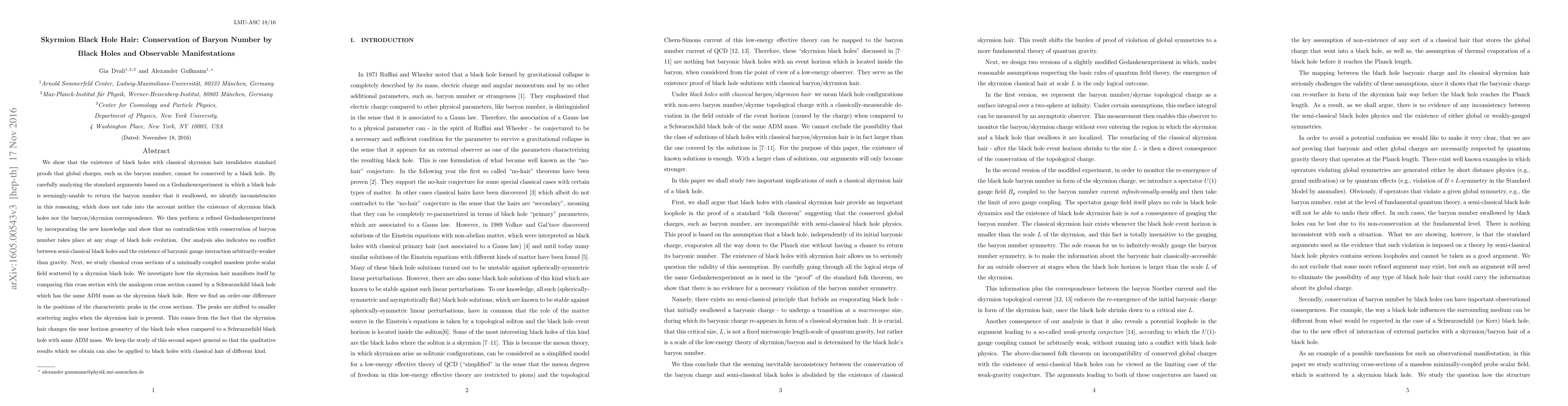 We show that the existence of black holes with classical skyrmion hair invalidates standard proofs that global charges, such as the baryon number, cannot be conserved by a black hole. By carefully analyzing the standard arguments based on a Gedankenexperiment in which a black hole is seemingly-unable to return the baryon number that it swallowed, we identify inconsistencies in this reasoning, which does not take into the account neither the existence of skyrmion black holes nor the baryon/skyrmion correspondence. We then perform a refined Gedankenexperiment by incorporating the new knowledge and show that no contradiction with conservation of baryon number takes place at any stage of black hole evolution. Our analysis also indicates no conflict between semi-classical black holes and the existence of baryonic gauge interaction arbitrarily-weaker than gravity. Next, we study classical cross sections of a minimally-coupled massless probe scalar field scattered by a skyrmion black hole. We investigate how the skyrmion hair manifests itself by comparing this cross section with the analogous cross section caused by a Schwarzschild black hole which has the same ADM mass as the skyrmion black hole. Here we find an order-one difference in the positions of the characteristic peaks in the cross sections. The peaks are shifted to smaller scattering angles when the skyrmion hair is present. This comes from the fact that the skyrmion hair changes the near horizon geometry of the black hole when compared to a Schwarzschild black hole with same ADM mass. We keep the study of this second aspect general so that the qualitative results which we obtain can also be applied to black holes with classical hair of different kind.