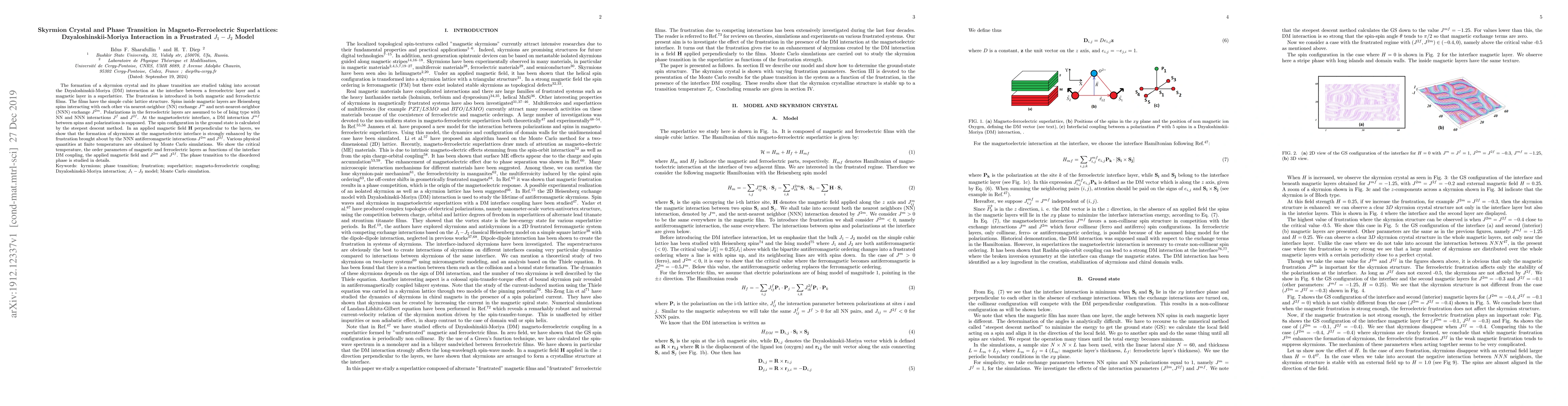 This paper investigates the formation of a skyrmion crystal and its phase transition in magneto-ferroelectric superlattices, focusing on the Dzyaloshinskii-Moriya interaction at the interface between magnetic and ferroelectric layers. The study employs a frustrated $J_1-J_2$ model and uses Monte Carlo simulations to determine critical temperatures and order parameters under various conditions.
