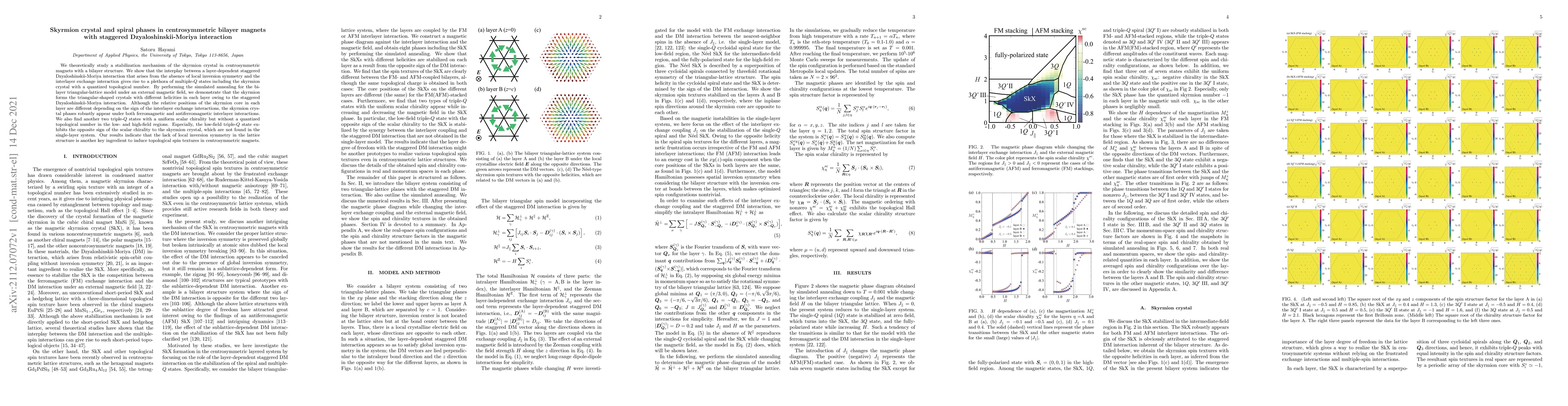 We theoretically study a stabilization mechanism of the skyrmion crystal in centrosymmetric magnets with a bilayer structure. We show that the interplay between a layer-dependent staggered Dzyaloshinskii-Moriya interaction that arises from the absence of local inversion symmetry and the interlayer exchange interaction gives rise to a plethora of multiple-$Q$ states including the skyrmion crystal with a quantized topological number. By performing the simulated annealing for the bilayer triangular-lattice model under an external magnetic field, we demonstrate that the skyrmion forms the triangular-shaped crystals with different helicities in each layer owing to the staggered Dzyaloshinskii-Moriya interaction. Although the relative positions of the skyrmion core in each layer are different depending on the sign of the interlayer exchange interactions, the skyrmion crystal phases robustly appear under both ferromagnetic and antiferromagnetic interlayer interactions. We also find another two triple-$Q$ states with a uniform scalar chirality but without a quantized topological number in the low- and high-field regions. Especially, the low-field triple-$Q$ state exhibits the opposite sign of the scalar chirality to the skyrmion crystal, which are not found in the single-layer system. Our results indicate that the lack of local inversion symmetry in the lattice structure is another key ingredient to induce topological spin textures in centrosymmetric magnets.