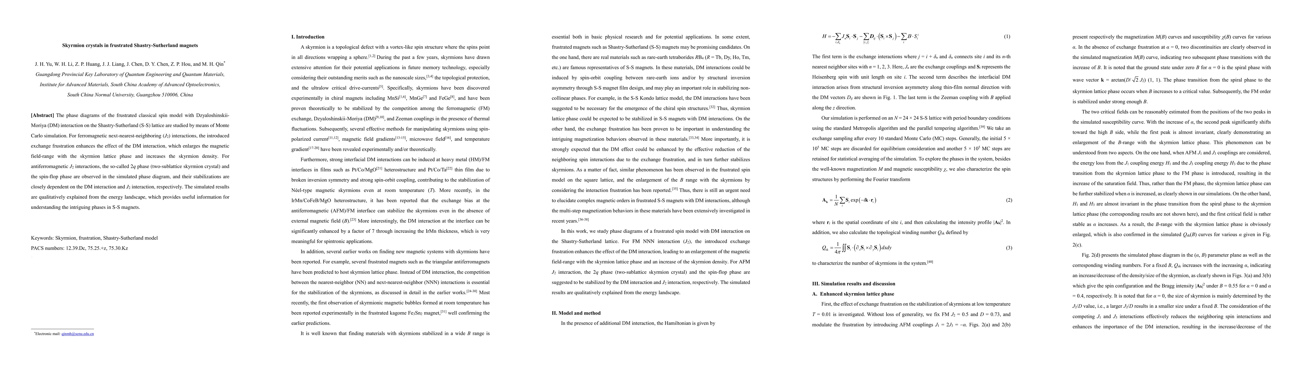 The phase diagrams of the frustrated classical spin model with Dzyaloshinskii-Moriya (DM) interaction on the Shastry-Sutherland (S-S) lattice are studied by means of Monte Carlo simulation. For ferromagnetic next-nearest-neighboring (J2) interactions, the introduced exchange frustration enhances the effect of the DM interaction, which enlarges the magnetic field-range with the skyrmion lattice phase and increases the skyrmion density. For antiferromagnetic J2 interactions, the so-called 2q phase (two-sublattice skyrmion crystal) and the spin-flop phase are observed in the simulated phase diagram, and their stabilizations are closely dependent on the DM interaction and J2 interaction, respectively. The simulated results are qualitatively explained from the energy landscape, which provides useful information for understanding the intriguing phases in S-S magnets.
