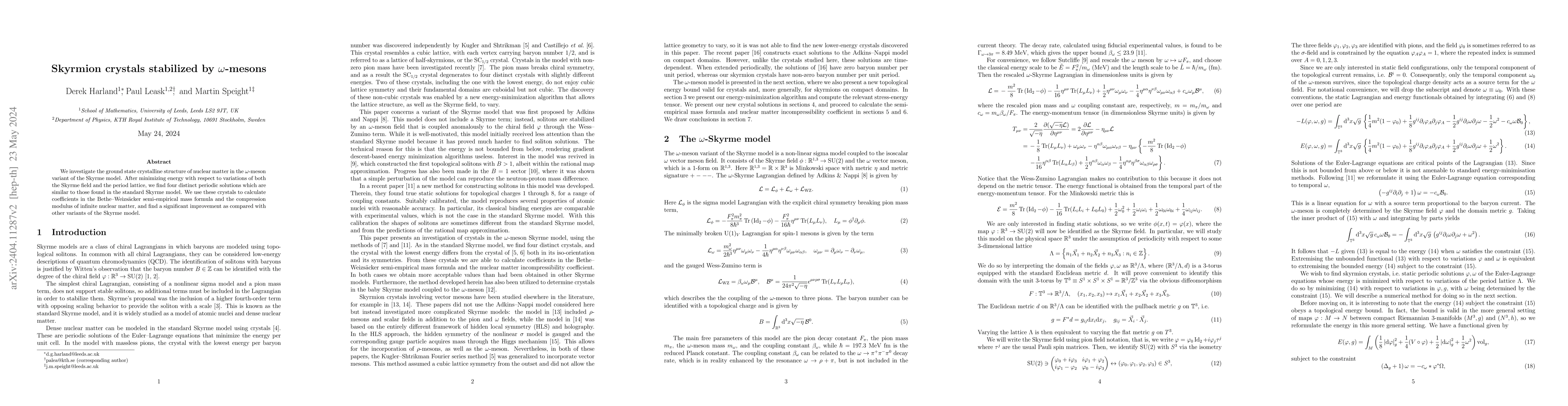 This study explores the crystalline structure of nuclear matter under an $\omega$-meson variant of the Skyrme model, identifying four periodic solutions that improve calculations for the Bethe-Weizsäcker mass formula and the compression modulus compared to other models.