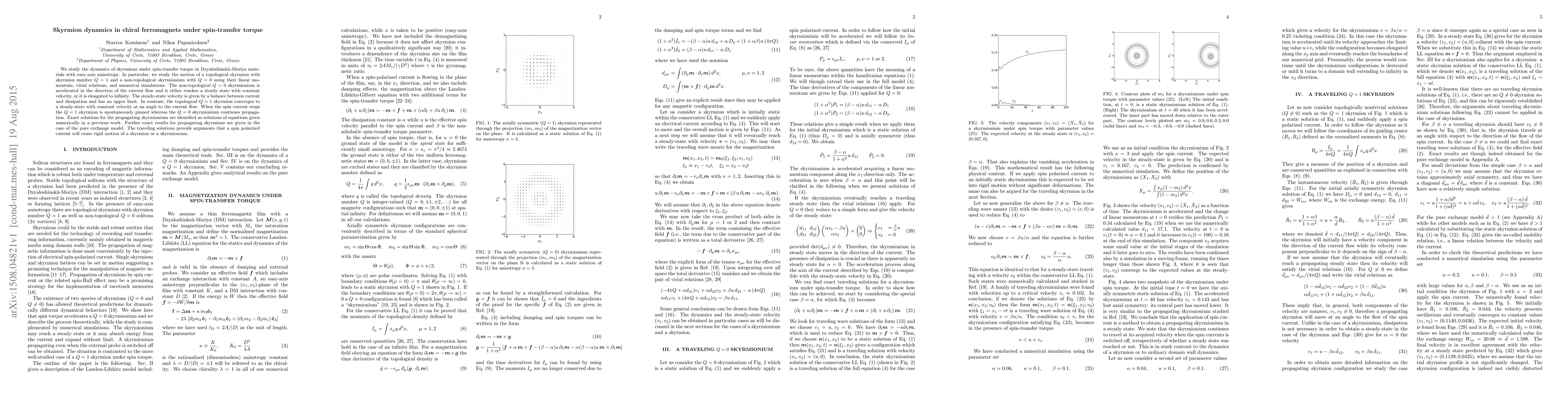 We study the dynamics of skyrmions under spin-transfer torque in Dzyaloshinskii-Moriya materials with easy-axis anisotropy. In particular, we study the motion of a topological skyrmion with skyrmion number $Q=1$ and a non-topological skyrmionium with $Q=0$ using their linear momentum, virial relations, and numerical simulations. The non-topological $Q=0$ skyrmionium is accelerated in the direction of the current flow and it either reaches a steady state with constant velocity, or it is elongated to infinity. The steady-state velocity is given by a balance between current and dissipation and has an upper limit. In contrast, the topological $Q=1$ skyrmion converges to a steady-state with constant velocity at an angle to the current flow. When the spin current stops the $Q=1$ skyrmion is spontaneously pinned whereas the $Q=0$ skyrmionium continues propagation. Exact solutions for the propagating skyrmionium are identified as solutions of equations given numerically in a previous work. Further exact results for propagating skyrmions are given in the case of the pure exchange model. The traveling solutions provide arguments that a spin-polarized current will cause rigid motion of a skyrmion or a skyrmionium.