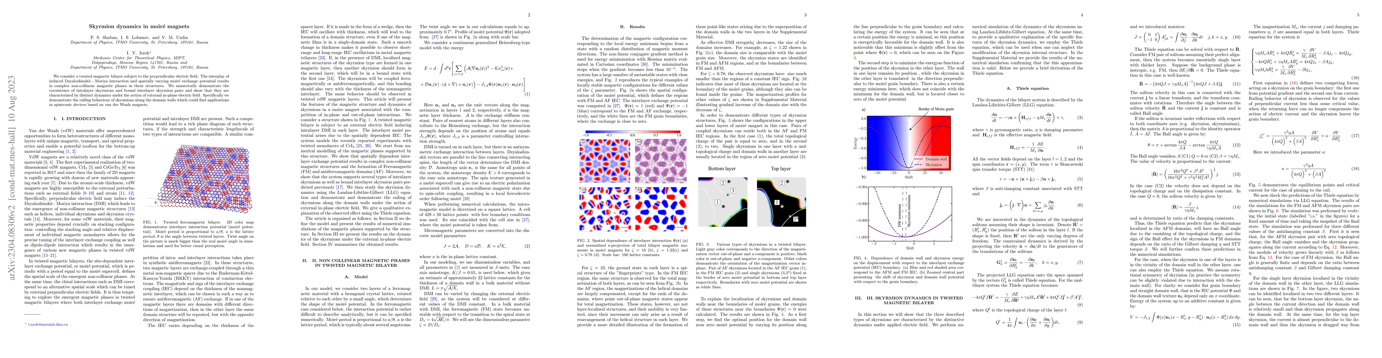 We consider a twisted magnetic bilayer subject to the perpendicular electric field. The interplay of induced Dzyaloshinskii - Moriya interaction and spatially varying moir\'e exchange potential results in complex non-collinear magnetic phases in these structures. We numerically demonstrate the coexistence of intralayer skyrmions and bound interlayer skyrmion pairs and show that they are characterized by distinct dynamics under the action of external in-plane electric field. Specifically we demonstrate the railing behaviour of skyrmions along the domain walls which could find applications in spintronic devices based on van der Waals magnets.