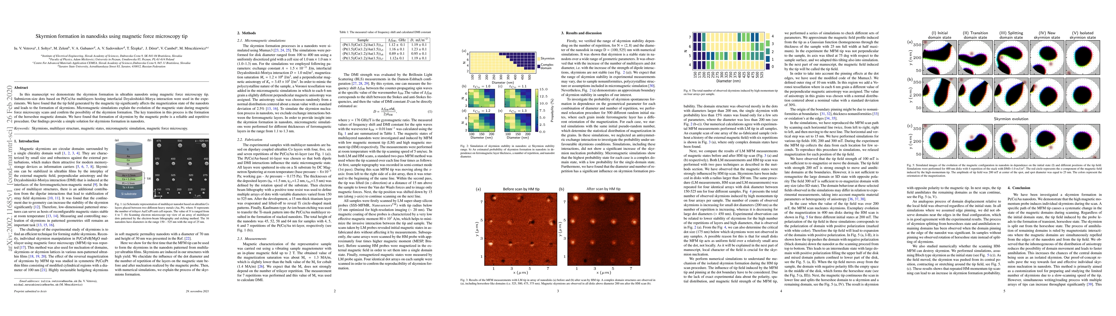 In this manuscript we demonstrate the skyrmion formation in ultrathin nanodots using magnetic force microscopy tip. Submicron-size dots based on Pt/Co/Au multilayers hosting interfacial Dzyaloshiskii-Morya interaction were used in the experiments. We have found that the tip field generated by the magnetic tip significantly affects the magnetization state of the nanodots and leads to the formation of skyrmions. Micromagnetic simulations explain the evolution of the magnetic state during magnetic force microscopy scans and confirm the possibility of the skyrmion formation. The key transition in this process is the formation of the horseshoe magnetic domain. We have found that formation of skyrmion by the magnetic probe is a reliable and repetitive procedure. Our findings provide a simple solution for skyrmions formation in nanodots.