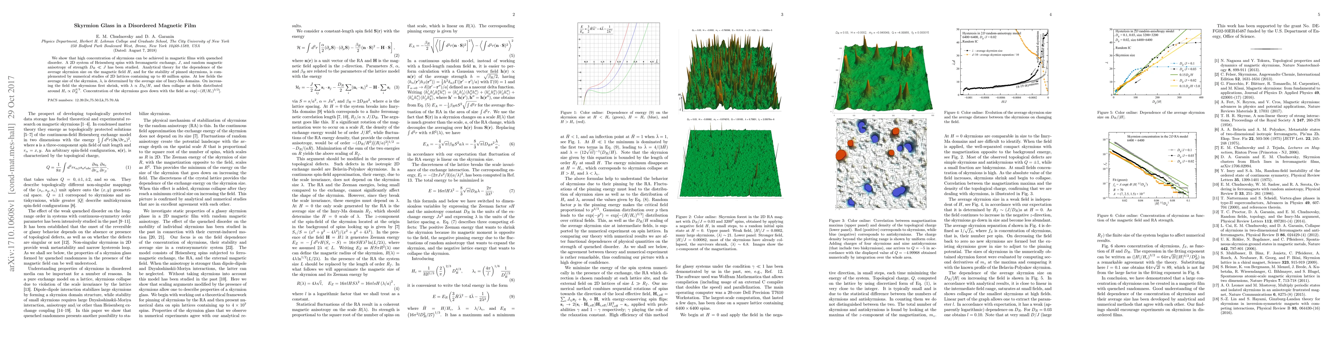 This research demonstrates that high concentrations of skyrmions, tiny whirls in magnetic orientation, can exist in disordered magnetic films. Through analytical theory and numerical simulations of large spin systems, it's found that skyrmion size and stability depend on magnetic field and disorder strength. Skyrmions shrink with increasing field, then collapse at specific field values, and their concentration decreases exponentially with field.