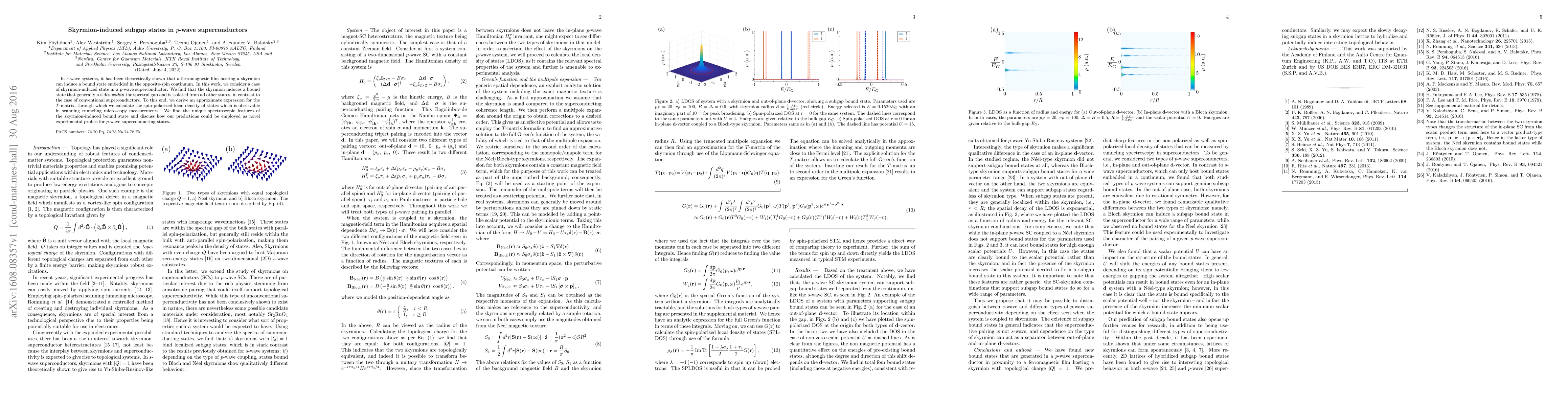 This paper investigates skyrmion-induced subgap states in p-wave superconductors, finding that skyrmions create isolated bound states within the spectral gap, unlike conventional superconductors. The study derives a $T$-matrix expression and predicts unique spectroscopic features observable in scanning tunneling microscopy, offering novel experimental probes for p-wave superconductivity.