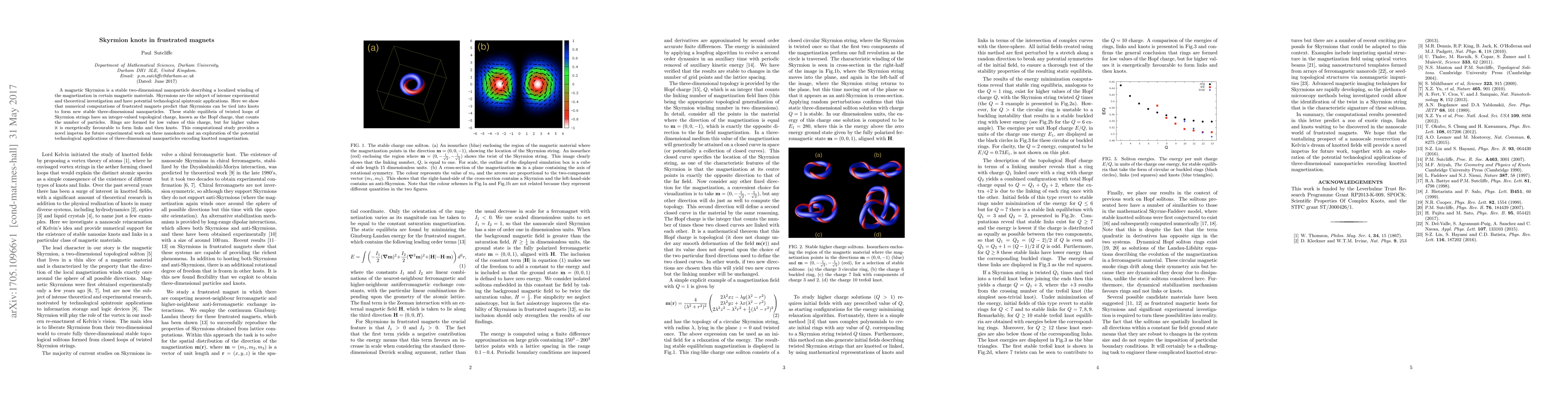 This research predicts, via numerical computations of frustrated magnets, the formation of stable three-dimensional Skyrmion knots, or nanoknots. These knotted structures have potential technological applications in spintronics, with their stability determined by an integer-valued topological charge.