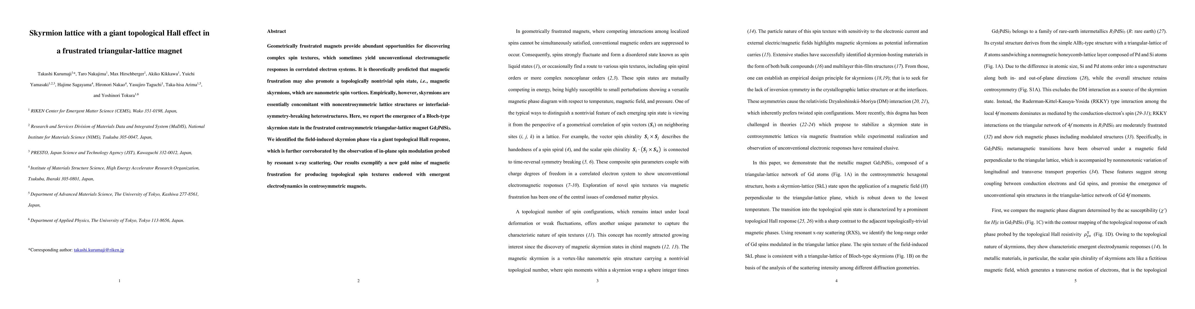 This paper reports the discovery of a Bloch-type skyrmion lattice in the centrosymmetric triangular-lattice magnet Gd2PdSi3, characterized by a giant topological Hall effect. The findings highlight the potential of magnetic frustration in creating topological spin textures with unique electromagnetic responses in conventional magnetic structures.