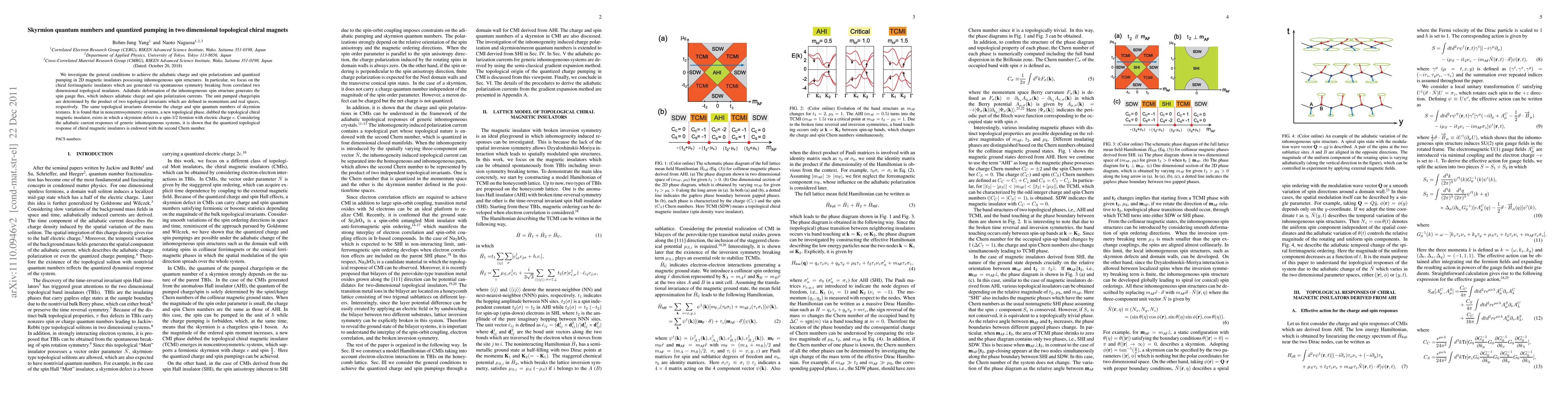 This paper investigates the conditions for quantized pumping in 2D topological chiral magnets, revealing a new topological phase with spin-1/2 fermions and electric charge $e$, and a second Chern number.
