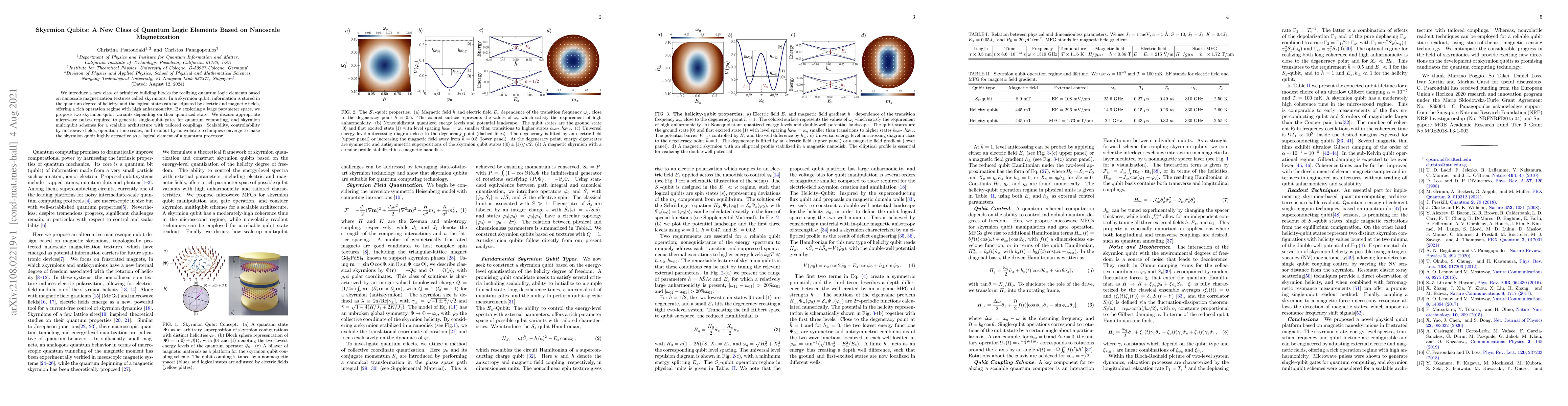 This paper introduces skyrmion qubits, a novel quantum logic element based on nanoscale magnetization textures, where information is stored in the helicity of skyrmions. The proposed skyrmion qubits offer high anharmonicity and can be manipulated by electric and magnetic fields, making them promising for scalable quantum computing architectures.