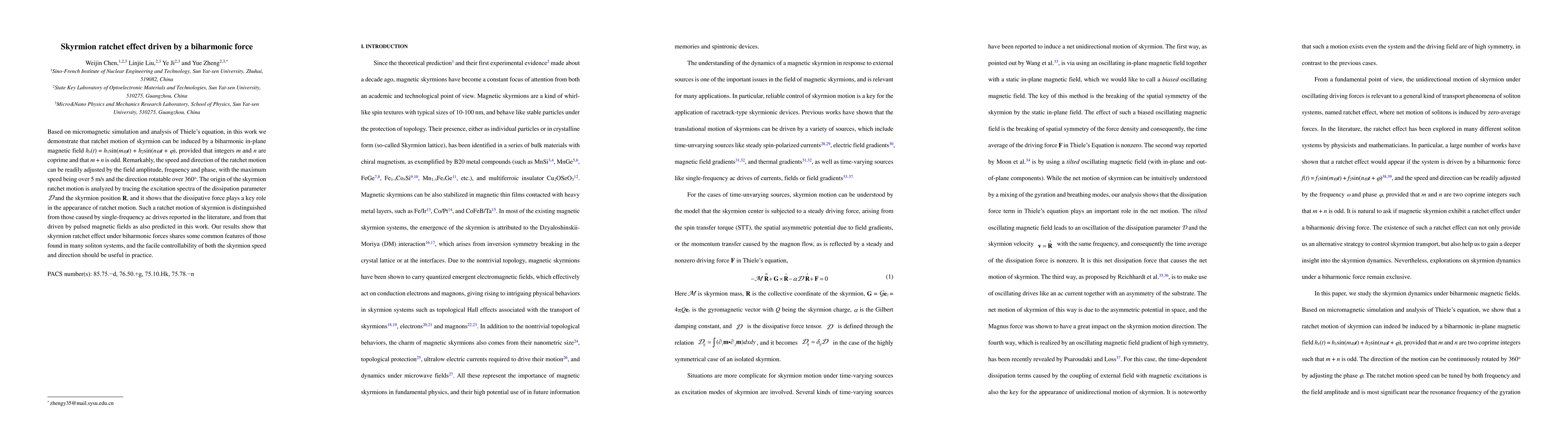 This research demonstrates that skyrmions can be driven into ratchet motion by a biharmonic magnetic field, with controllable speed and direction via field parameters. The study reveals that the dissipative force is crucial for this effect, distinguishing it from single-frequency ac drives and pulsed magnetic fields.
