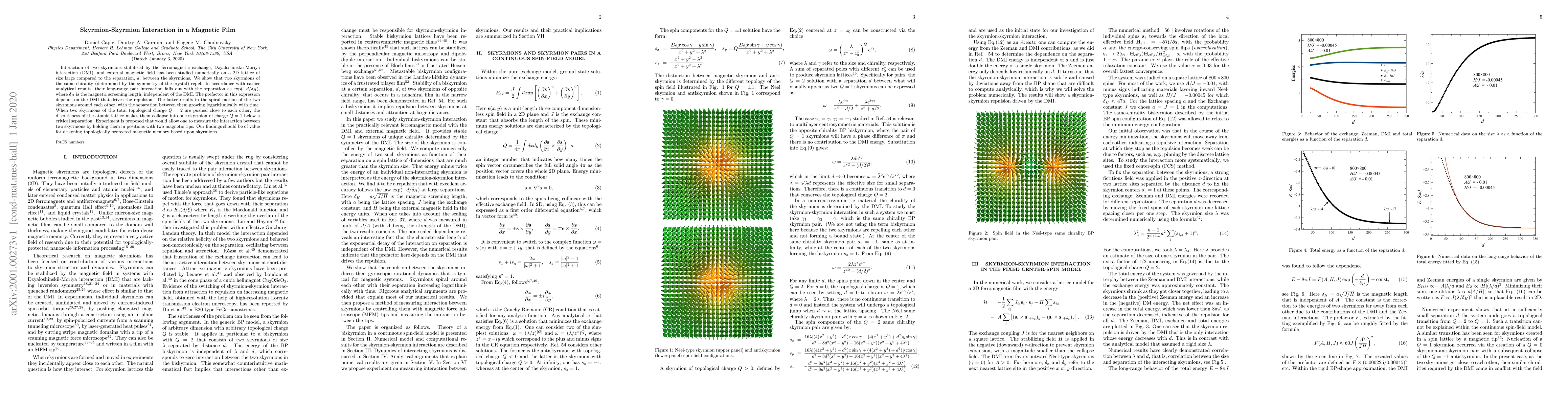 Interaction of two skyrmions stabilized by the ferromagnetic exchange, Dzyaloshinskii-Moriya interaction (DMI), and external magnetic field has been studied numerically on a 2D lattice of size large compared to the separation, $d$, between the skyrmions. We show that two skyrmions of the same chirality (determined by the symmetry of the crystal) repel. In accordance with earlier analytical results, their long-range pair interaction falls out with the separation as $\exp(-d/\delta_H)$, where $\delta_H$ is the magnetic screening length, independent of the DMI. The prefactor in this expression depends on the DMI that drives the repulsion. The latter results in the spiral motion of the two skyrmions around each other, with the separation between them growing logarithmically with time. When two skyrmions of the total topological charge $Q = 2$ are pushed close to each other, the discreteness of the atomic lattice makes them collapse into one skyrmion of charge $Q = 1$ below a critical separation. Experiment is proposed that would allow one to measure the interaction between two skyrmions by holding them in positions with two magnetic tips. Our findings should be of value for designing topologically protected magnetic memory based upon skyrmions.