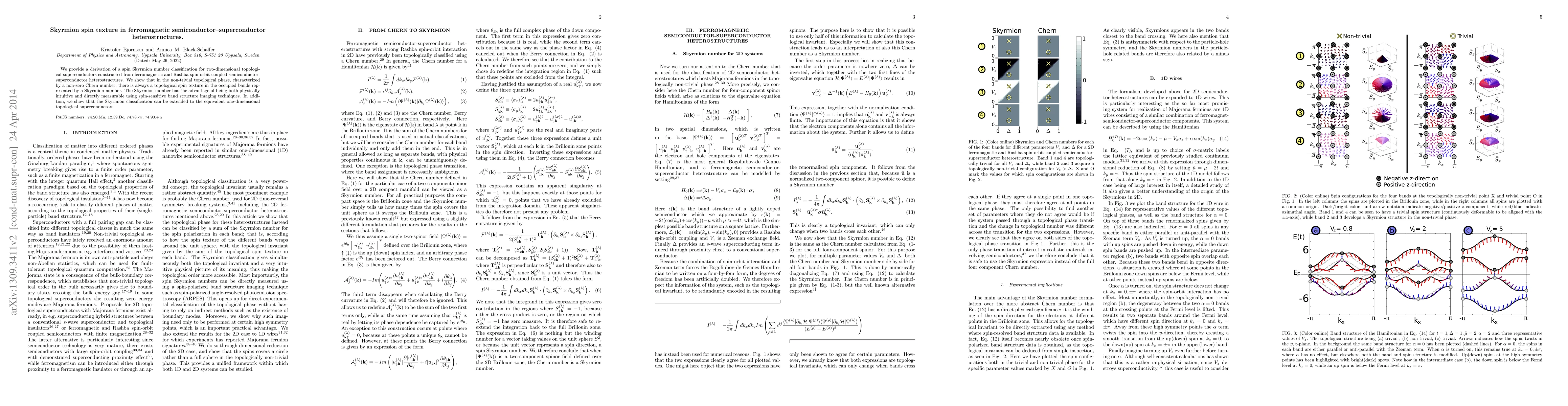 This paper derives a spin Skyrmion number classification for topological superconductors in ferromagnetic semiconductor-superconductor heterostructures, showing a topological spin texture in the occupied bands. The Skyrmion number is both physically intuitive and measurable, extending the classification to one-dimensional topological superconductors.