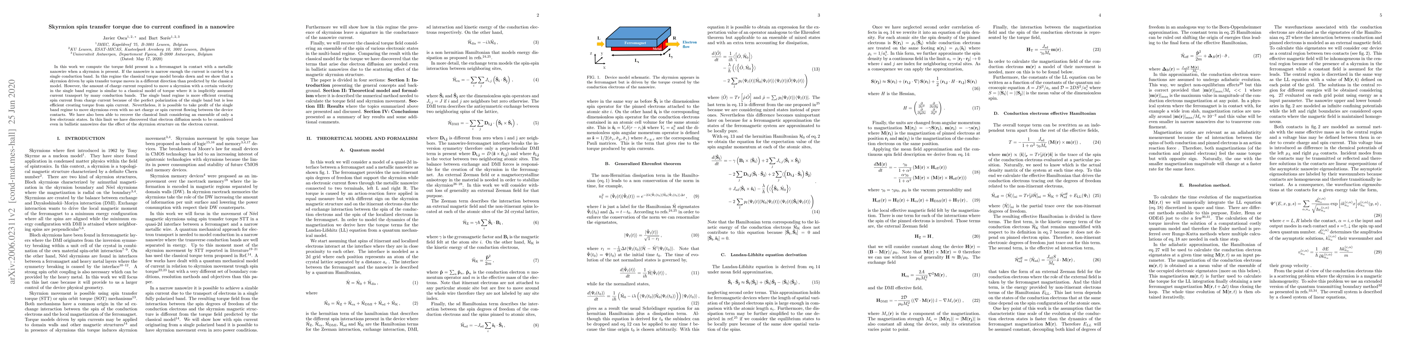 In this work we compute the torque field present in a ferromagnet in contact with a metallic nanowire when a skyrmion is present. If the nanowire is narrow enough the current is carried by a single conduction band. In this regime the classical torque model breaks down and we show that a skyrmion driven by spin transfer torque moves in a different direction than predicted by the classical model. However, the amount of charge current required to move a skyrmion with a certain velocity in the single band regime is similar to a classical model of torque where it is implicitly assumed current transport by many conduction bands. The single band regime is more efficient creating spin current from charge current because of the perfect polarization of the single band but is less efficient creating torque from spin current. Nevertheless, it is possible to take profit of the single band regime to move skyrmions even with no net charge or spin current flowing between the device contacts. We have also been able to recover the classical limit considering an ensemble of only a few electronic states. In this limit we have discovered that electron diffusion needs to be considered even in ballistic nanowires due the effect of the skyrmion structure on the electron current.