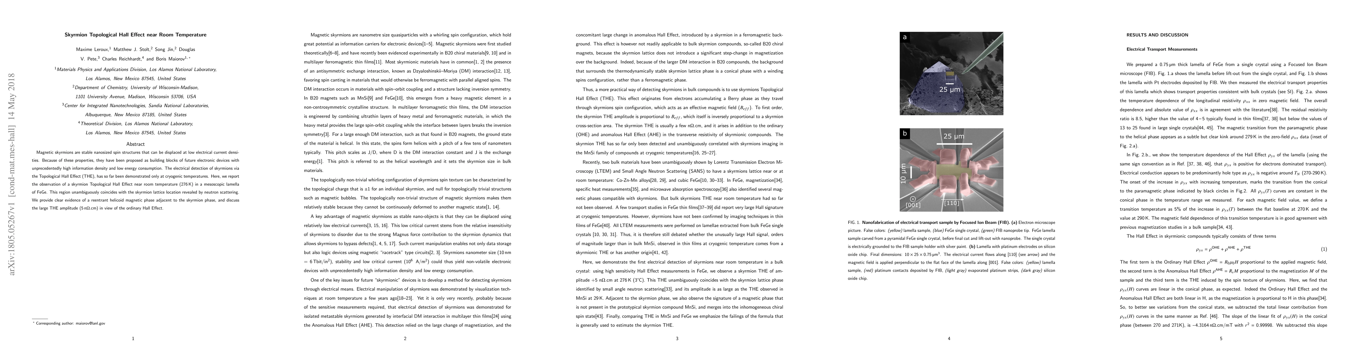 This paper reports the observation of a skyrmion Topological Hall Effect (THE) near room temperature (276 K) in FeGe, demonstrating skyrmion detection at higher temperatures. The THE amplitude is large, indicating potential for future low-energy electronic devices.