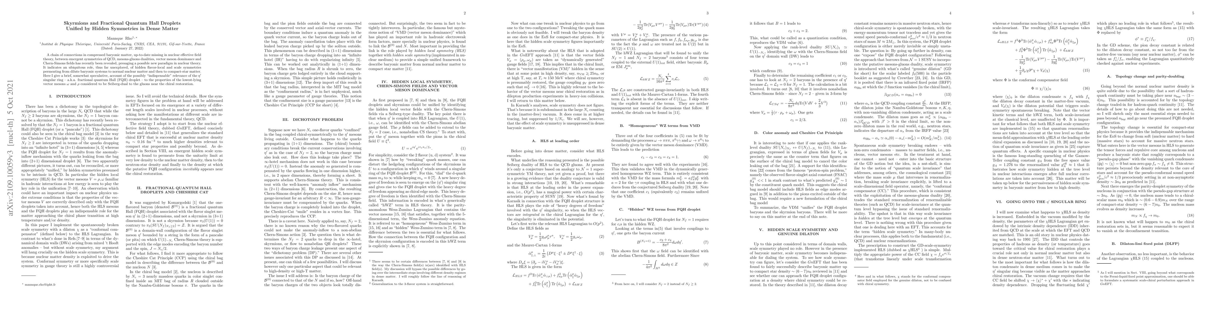 A chain of connections in compressed baryonic matter, up-to-date glaringly missing in nuclear effective field theory, between intrinsic or emergent symmetries of QCD, mesons-gluons dualities, vector meson dominance and Chern-Simons fields has recently been revealed, presaging a possible new paradigm in nuclear theory. It indicates a ubiquitous role, thus far unexplored, of hidden symmetries -- flavor-local and scale -- permeating from dilute baryonic systems to normal nuclear matter and then to compact-star matter. Here I give a brief account of the possibly "indispensable" relevance of the $\eta^\prime$ singular ring, a.k.a. fractional quantum Hall (FQH) droplet, to the properties of the lowest-lying vector mesons $\omega$ and $\rho$, relevant to dilepton production processes, argued to be Seiberg-dual to the gluons near the chiral restoration.