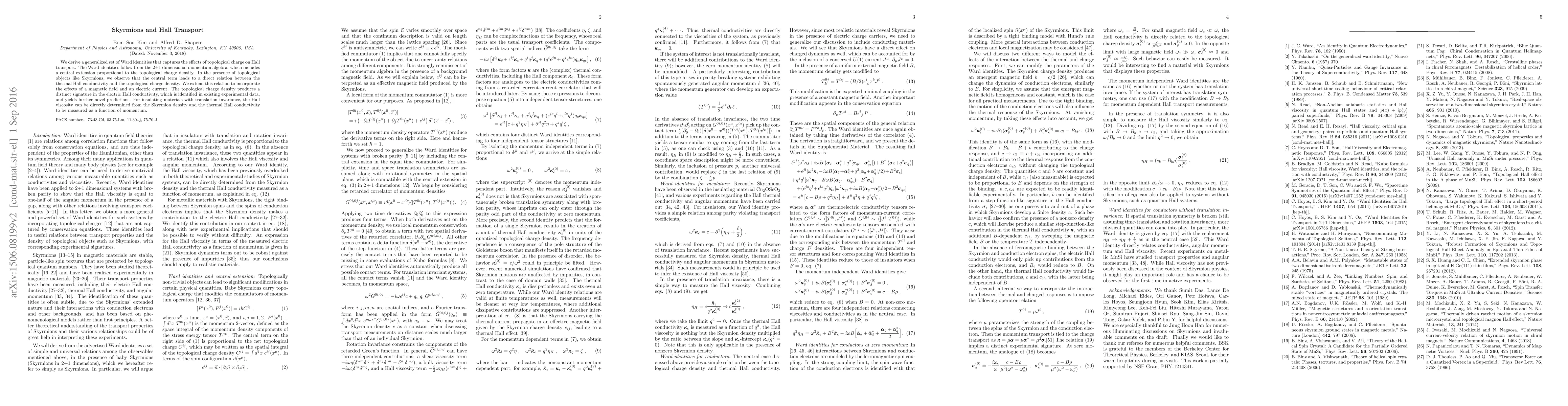 This paper derives Ward identities linking topological charge density to Hall transport in 2+1 dimensions, showing a direct relation between thermal Hall conductivity and Skyrmion density, with implications for electric Hall conductivity and Hall viscosity in insulating materials. Experimental signatures and novel predictions are identified.