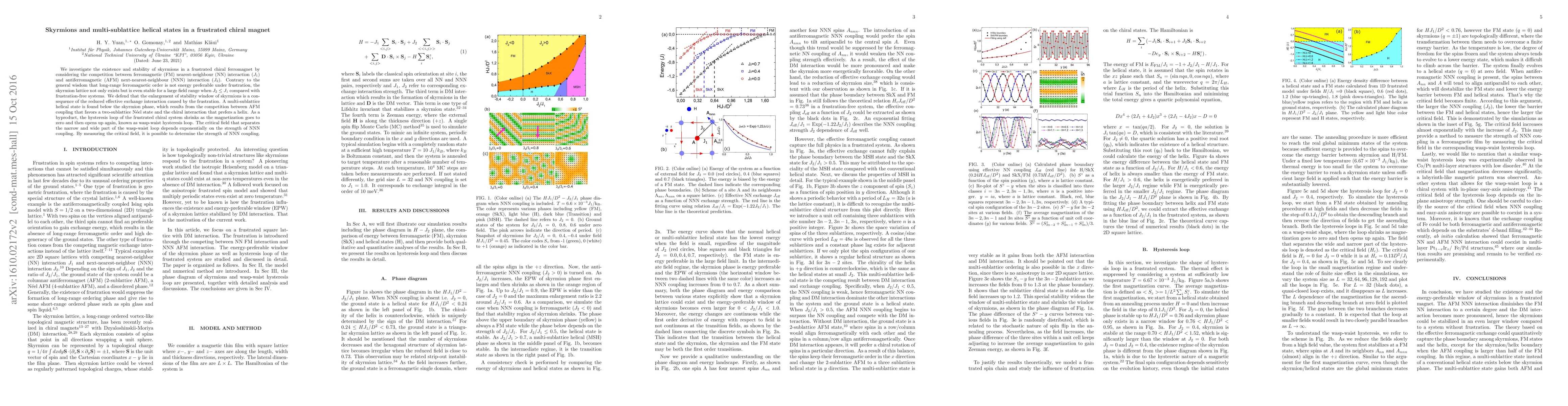 This paper explores the stability of skyrmions in a frustrated chiral magnet under competing ferromagnetic and antiferromagnetic interactions, finding that skyrmions are stable over a large field range due to reduced effective exchange interaction. It also identifies a multi-sublattice helical state beneath the skyrmion phase, and describes a unique "wasp-waist" hysteresis loop dependent on the next-nearest-neighbour coupling strength.